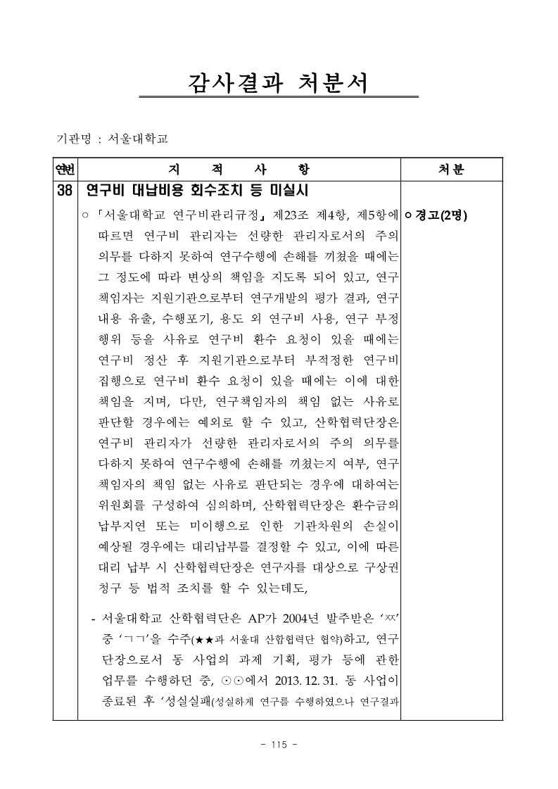 - 서울대학교 산학협력단은 AP가 2004년 발주받은 ‘ㅉ 중 ‘ㄱㄱ’을 수주(★★과 서울대 산합협력단 협약)하고, 연구 단장으로서 동 사업의 과제 기획, 평가 등에 관한 업무를 수행하던 중, ⊙⊙에서 2013. 12. 31. 동 사업이 종료된 후 ‘성실실패(성실하게 연구를 수행하였으나 연구결과 실패)’로 결정하고, 2014.9.24. 과학기술기본법 제11조의 2 국가연구개발사업의 관리 등에 관한 규정 제27조에 따라 최종연도 정부 출연금의 70%(1,462,300천원) 환수 주관 연구책임자 AP에 대하여 참여 제한 2년의 처분을 하였고, 동 처분은 행정소송(****법원 2014****, ****법원 2016****) 결과 2016. 12. 29. 원고(서울대학교산학협력단 외 1명) 패소 확정됨에 따라 서울대학교 산학협력단은 위 환수금 1,462,300천원을 3회(’15.8.21/‘16.1.14./’16.6.14.)에 걸쳐 산학협력단 간접비 회계에서 대납하고도 위 대납 금액에 대하여 자체 심의위원회 구성을 통한 위 AP의 과실 여부 판단 및 손해보전을 위한 구상권 청구 등 조치 없이 수년간 방치한 사실이 있음.