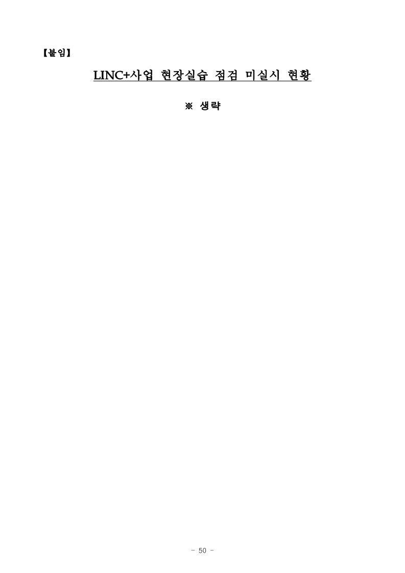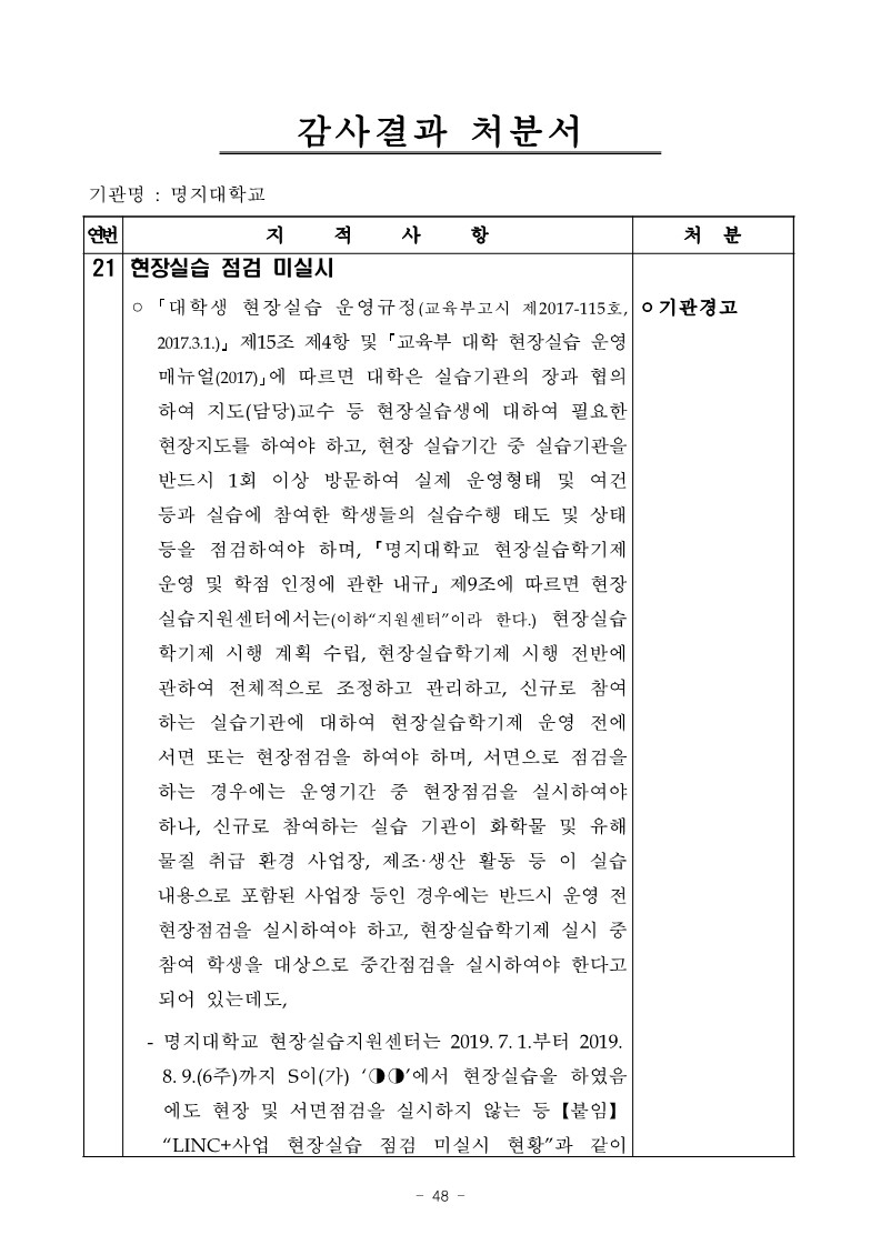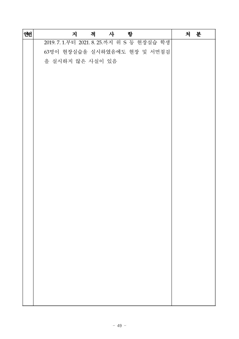 - 명지대학교 현장실습지원센터는 2019. 7. 1.부터 2019. 8. 9.(6주)까지 S이(가) ‘◑◑’에서 현장실습을 하였음 에도 현장 및 서면점검을 실시하지 않는 등【붙임】 “LINC+사업 현장실습 점검 미실시 현황”과 같이 2019. 7. 1.부터 2021. 8. 25.까지 위 S 등 현장실습 학생 63명이 현장실습을 실시하였음에도 현장 및 서면점검 을 실시하지 않은 사실이 있음