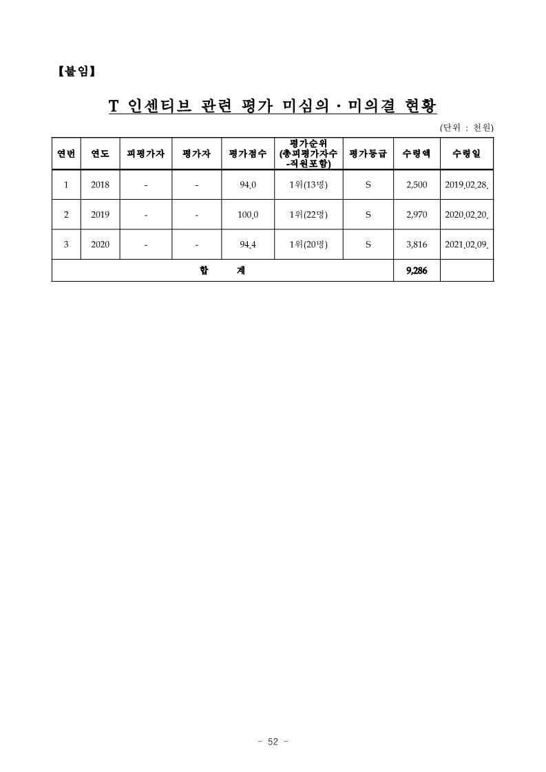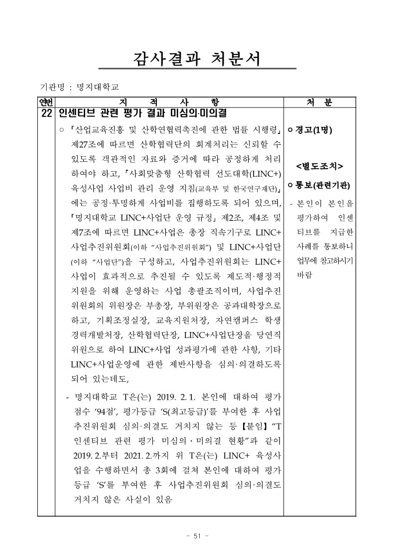 - 명지대학교 T은(는) 2019. 2. 1. 본인에 대하여 평가 점수 ‘94점’, 평가등급 ‘S(최고등급)’를 부여한 후 사업 추진위원회 심의·의결도 거치지 않는 등【붙임】“T 인센티브 관련 평가 미심의․미의결 현황”과 같이 2019. 2.부터 2021. 2.까지 위 T은(는) LINC+ 육성사 업을 수행하면서 총 3회에 걸쳐 본인에 대하여 평가 등급 ‘S’를 부여한 후 사업추진위원회 심의·의결도 거치지 않은 사실이 있음