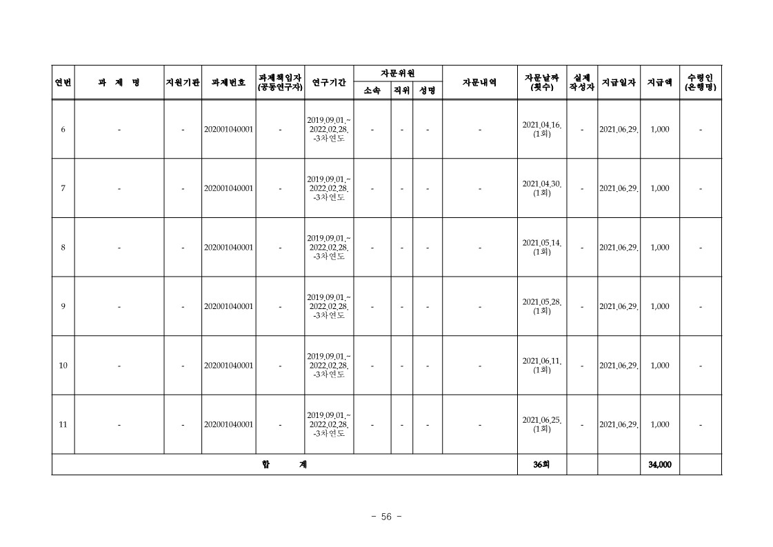- 명지대학교 U은(는) 2020. 10. 29. ‘ㅎ 연구’ 과제의 연구보조자로 참여하면서, 2020. 10. 25. ‘ㄲ’에 대한 자문 명목으로 본인의 배우자인 V에게 자문을 요청 하는 내용을 담은 전문가 활용 업무 요청서(1차 2020.9.21.~2020.10.23., 연구책임자 명의)를 작성하고, 실제 로 본인이 자문의견서를 작성하고도 위 V(으)로부터 2020. 11. 9.부터 2020. 11. 20.까지 10일간 50시간 자문 을 받은 것처럼 자문의견서를 작성하여 제출한 후 2020. 10. 29. 위 V에게 전문가 자문료 10,000천원을 지급하는 등【붙임】“전문가 자문료 부당 집행 현황” 과 같이 2020. 10. 29.부터 2021. 6. 29.까지 위 U은(는 본인이 직접 자문의견서 등을 작성하고도 위 V(으)로 부터 연구 시스템구축 자문 등 총 36차례 자문을 받 은 것처럼 자문의견서 등을 작성·제출한 후 위 V에게 전문가 자문료 합계 34,000천원을 지급한 사실이 있음