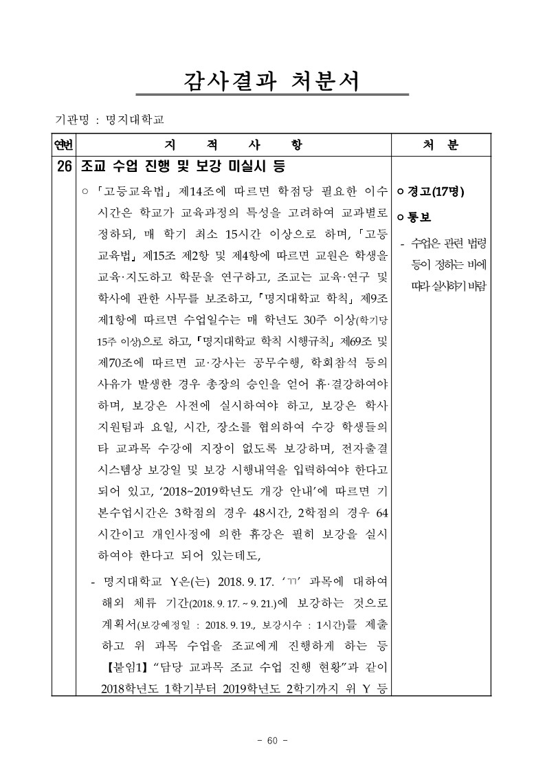 - 명지대학교 Y은(는) 2018. 9. 17. ‘ㄲ’ 과목에 대하여 해외 체류 기간(2018. 9. 17. ~ 9. 21.)에 보강하는 것으로 계획서(보강예정일 : 2018. 9. 19., 보강시수 : 1시간)를 제출 하고 위 과목 수업을 조교에게 진행하게 하는 등 【붙임1】“담당 교과목 조교 수업 진행 현황”과 같이 2018학년도 1학기부터 2019학년도 2학기까지 위 Y 등 교원 11명은 위 ‘ㄲ’ 과목 등 11개 교과목, 총 46.5시수 수업을 조교가 진행하게 한 사실이 있고,