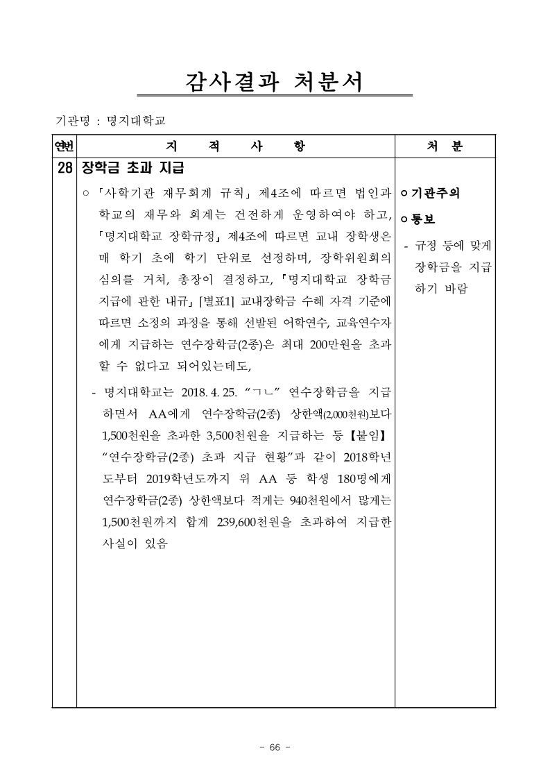 ◦ 사학기관 재무회계 규칙 제4조에 따르면 법인과 학교의 재무와 회계는 건전하게 운영하여야 하고 명지대학교 장학규정 제4조에 따르면 교내 장학생은 매 학기 초에 학기 단위로 선정하며, 장학위원회의 심의를 거쳐, 총장이 결정하고, 명지대학교 장학금 지급에 관한 내규 [별표1] 교내장학금 수혜 자격 기준에 따르면 소정의 과정을 통해 선발된 어학연수, 교육연수자 에게 지급하는 연수장학금(2종)은 최대 200만원을 초과 할 수 없다고 되어있는데도,