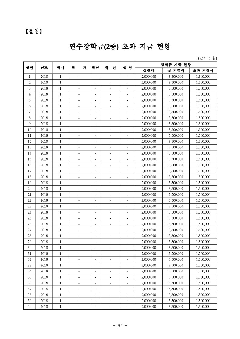 - 명지대학교는 2018. 4. 25. “ㄱㄴ” 연수장학금을 지급 하면서 AA에게 연수장학금(2종) 상한액(2,000천원)보다 1,500천원을 초과한 3,500천원을 지급하는 등【붙임】 “연수장학금(2종) 초과 지급 현황”과 같이 2018학년 도부터 2019학년도까지 위 AA 등 학생 180명에게 연수장학금(2종) 상한액보다 적게는 940천원에서 많게는 1,500천원까지 합계 239,600천원을 초과하여 지급한 사실이 있음