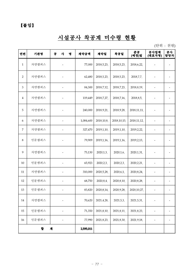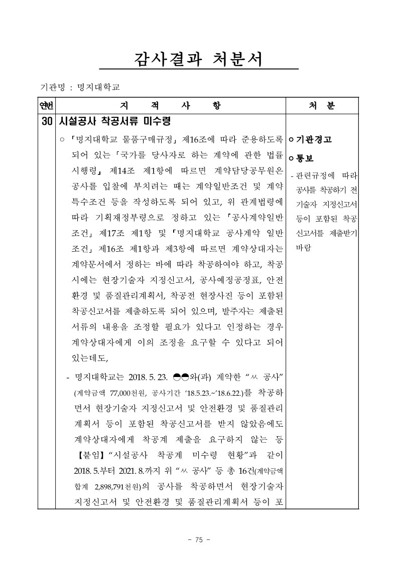 - 명지대학교는 2018. 5. 23. ◓◓와(과) 계약한 “ㅆ 공사” (계약금액 77,000천원, 공사기간 ‘18.5.23.~’18.6.22.)를 착공하 면서 현장기술자 지정신고서 및 안전환경 및 품질관리 계획서 등이 포함된 착공신고서를 받지 않았음에도 계약상대자에게 착공계 제출을 요구하지 않는 등 【붙임】“시설공사 착공계 미수령 현황”과 같이 2018. 5.부터 2021. 8.까지 위 “ㅆ 공사” 등 총 16건(계약금액 합계 2,898,791천원)의 공사를 착공하면서 현장기술자 지정신고서 및 안전환경 및 품질관리계획서 등이 포함된 착공신고서를 받지 않았음에도 계약상대자에게 착공계 제출을 요구하지 않은 사실이 있음