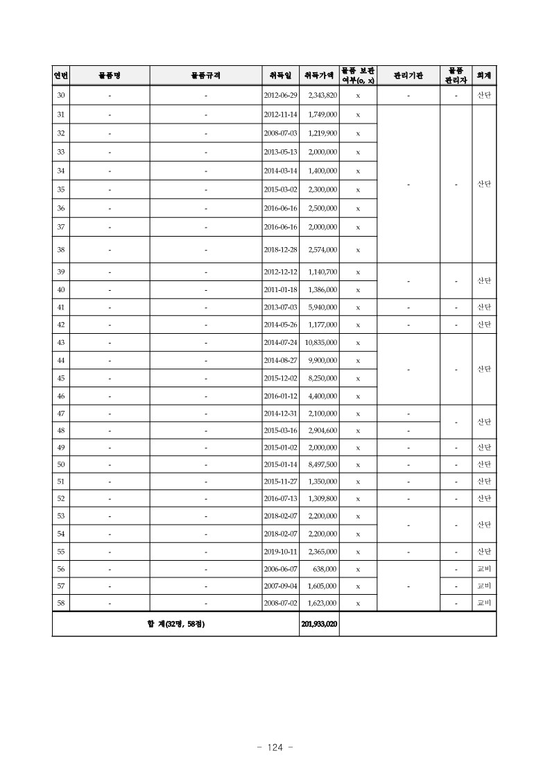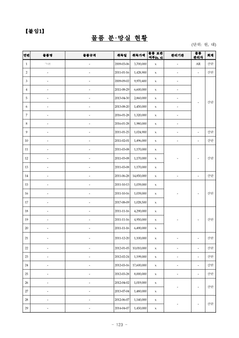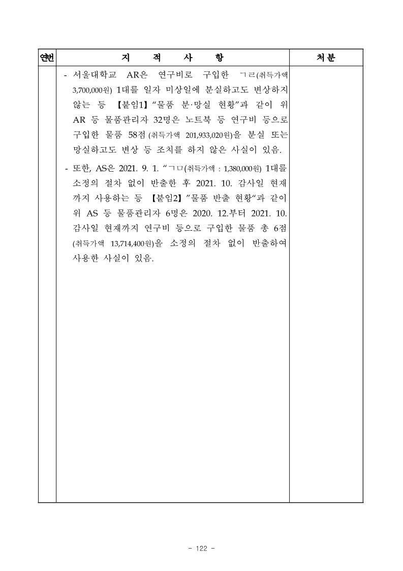 - 서울대학교 AR은 연구비로 구입한 ㄱㄹ(취득가액 3,700,000원) 1대를 일자 미상일에 분실하고도 변상하지 않는 등 【붙임1】“물품 분·망실 현황”과 같이 위 AR 등 물품관리자 32명은 노트북 등 연구비 등으로 구입한 물품 58점(취득가액 201,933,020원)을 분실 또는 망실하고도 변상 등 조치를 하지 않은 사실이 있음.