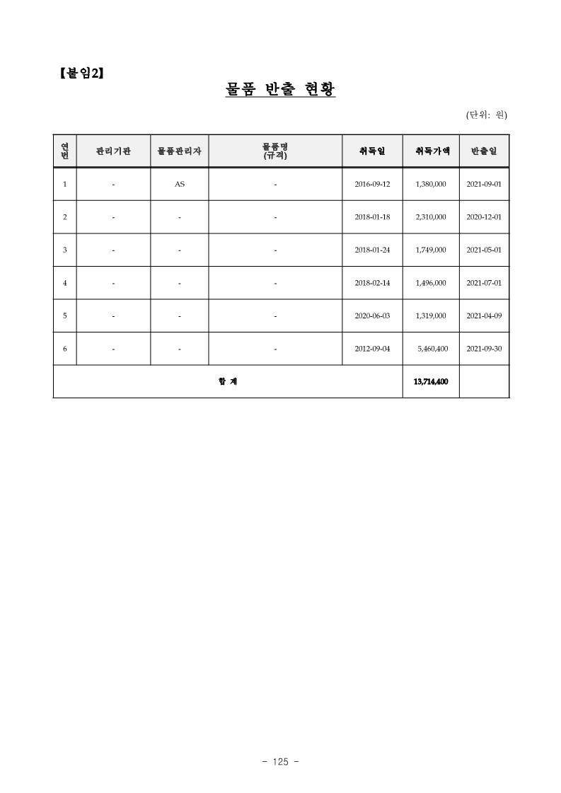 - 또한, AS은 2021. 9. 1. “ㄱㅁ(취득가액 : 1,380,000원) 1대를 소정의 절차 없이 반출한 후 2021. 10. 감사일 현재 까지 사용하는 등 【붙임2】”물품 반출 현황“과 같이 위 AS 등 물품관리자 6명은 2020. 12.부터 2021. 10. 감사일 현재까지 연구비 등으로 구입한 물품 총 6점 (취득가액 13,714,400원)을 소정의 절차 없이 반출하여 사용한 사실이 있음.
