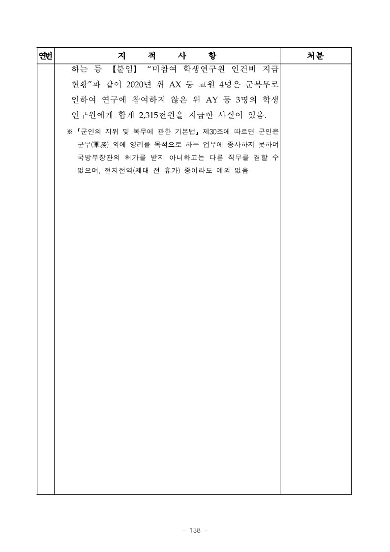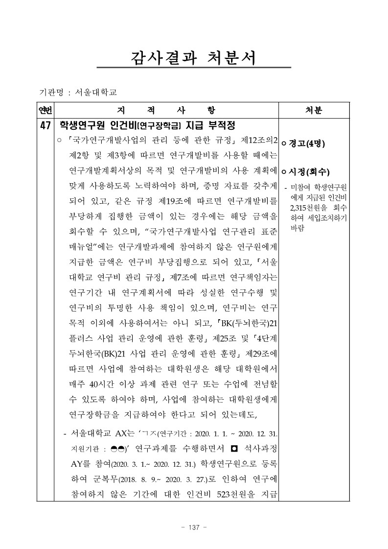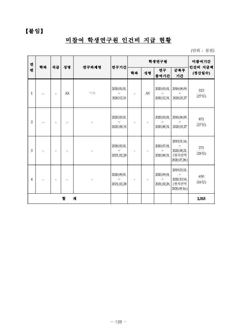 - 서울대학교 AX는 ‘ㄱㅈ(연구기간 : 2020. 1. 1. ~ 2020. 12.31 지원기관 : ◓◓)’ 연구과제를 수행하면서 ◘ 석사과정 AY를 참여(2020. 3. 1.~ 2020. 12. 31.) 학생연구원으로 등록 하여 군복무(2018. 8. 9.~ 2020. 3. 27.)로 인하여 연구에 참여하지 않은 기간에 대한 인건비 523천원을 지급 하는 등 【붙임】 “미참여 학생연구원 인건비 지급 현황”과 같이 2020년 위 AX 등 교원 4명은 군복무로 인하여 연구에 참여하지 않은 위 AY 등 3명의 학생 연구원에게 합계 2,315천원을 지급한 사실이 있음.