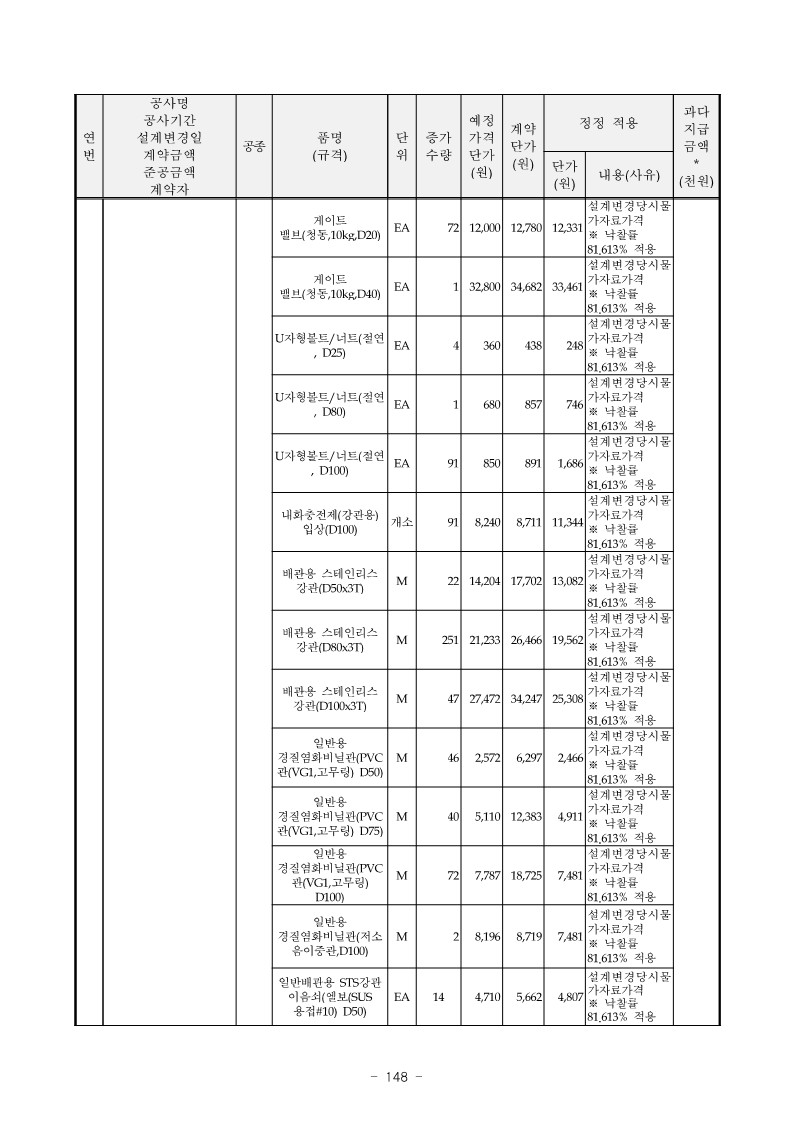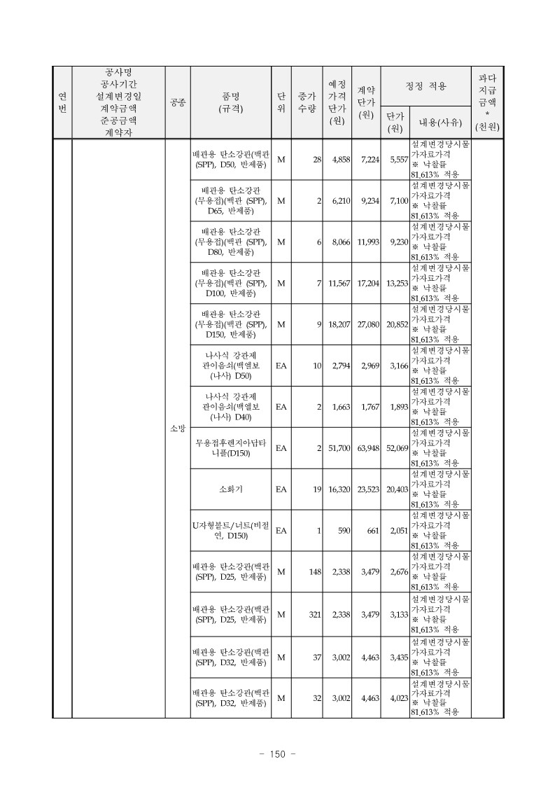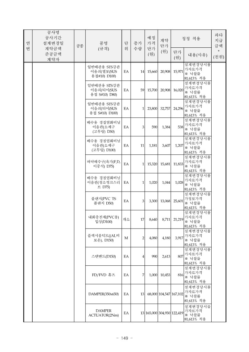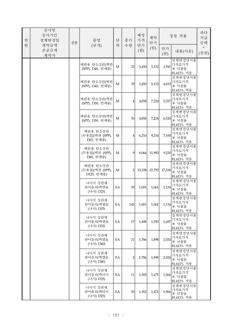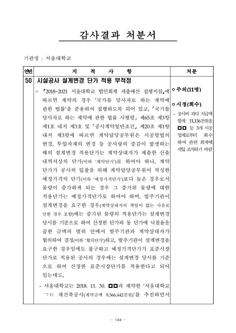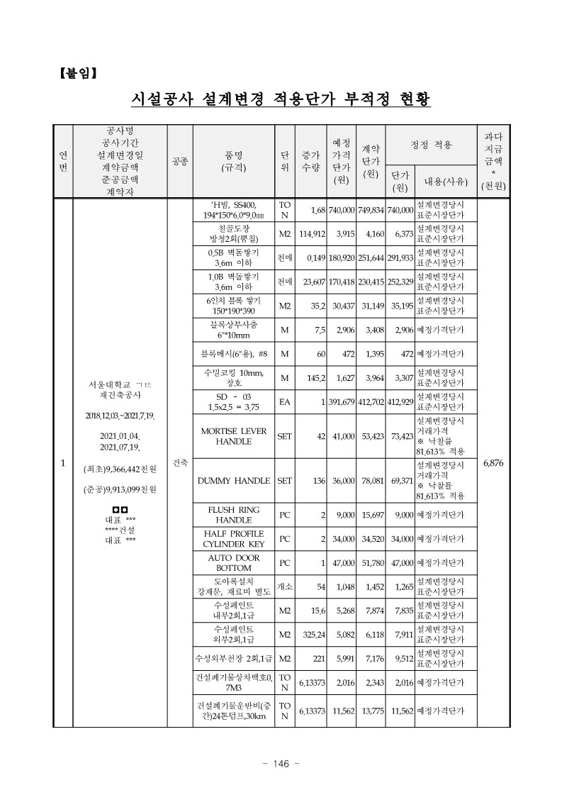 - 서울대학교는 2018. 11. 30. ◘◘과 계약한 ‘서울대학교 ㄱㅌ 재건축공사(계약금액 9,366,442천원)’를 추진하면서 학교측 요구로 발생한 설계변경에 대하여 예정가격 단가보다 계약단가가 높은 H빔*(규격 194*150*6.0*9.0㎜ 등 물량이 증가된 품목에 대한 적용단가를 설계변경 당시를 기준으로 하여 산정한 표준시장단가가 아닌 계약단가로 적용하여 공사비 6,876천원을 과다 지급 하는 등【붙임】“시설공사 설계변경 적용단가 부적정 현황”과 같이 2018. 11.월부터 2021. 10. 감사일 현재 까지 위 ‘서울대학교 ㄱㅌ 재건축공사’ 등 3건 공사를 추진하면서 학교측 요구 등으로 발생한 설계변경에 대하여 예정가격단가보다 계약단가가 높은데도 물량이 증가되는 품목의 적용단가를 예정가격단가 또는 설계 변경 당시를 기준으로 하여 산정한 협의단가(또는 표준시장단가)가 아닌 계약단가로 적용하여 공사비 합계 11,136천원을 과다 지급한 사실이 있음.