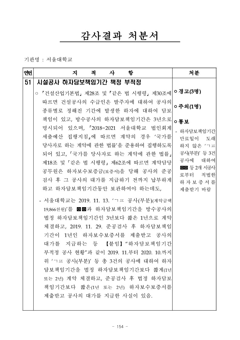 - 서울대학교는 2019. 11. 13. ‘ㄱㅍ 공사(부분)(계약금액 19,866천원)’를 ◙◙과 하자담보책임기간을 방수공사의 법정 하자담보책임기간인 3년보다 짧은 1년으로 계약 체결하고, 2019. 11. 29. 준공검사 후 하자담보책임 기간이 1년인 하자보수보증서를 제출받고 공사의 대가를 지급하는 등 【붙임】“하자담보책임기간 부적정 공사 현황”과 같이 2019. 11.부터 2020. 10.까지 위 ‘ㄱㅍ 공사(부분)’ 등 총 3건의 공사에 대하여 하자 담보책임기간을 법정 하자담보책임기간보다 짧게(1년 또는 2년) 계약 체결하고, 준공검사 후 법정 하자담보 책임기간보다 짧은(1년 또는 2년) 하자보수보증서를 제출받고 공사의 대가를 지급한 사실이 있음.