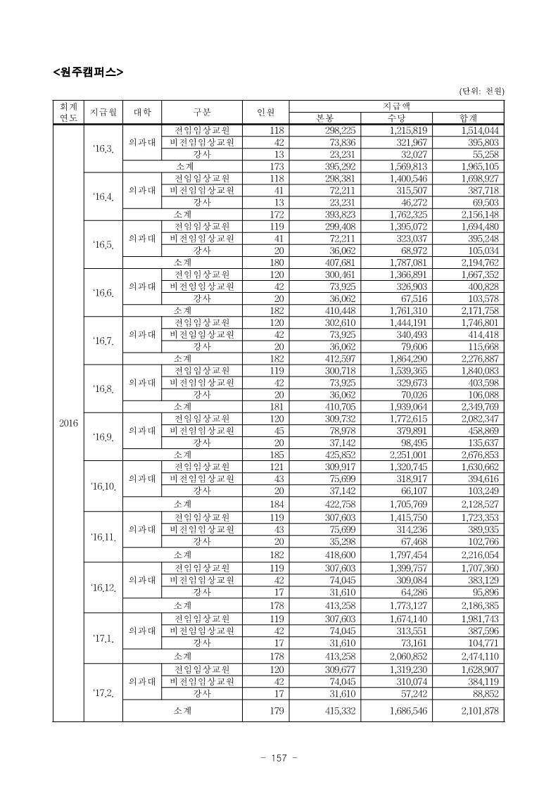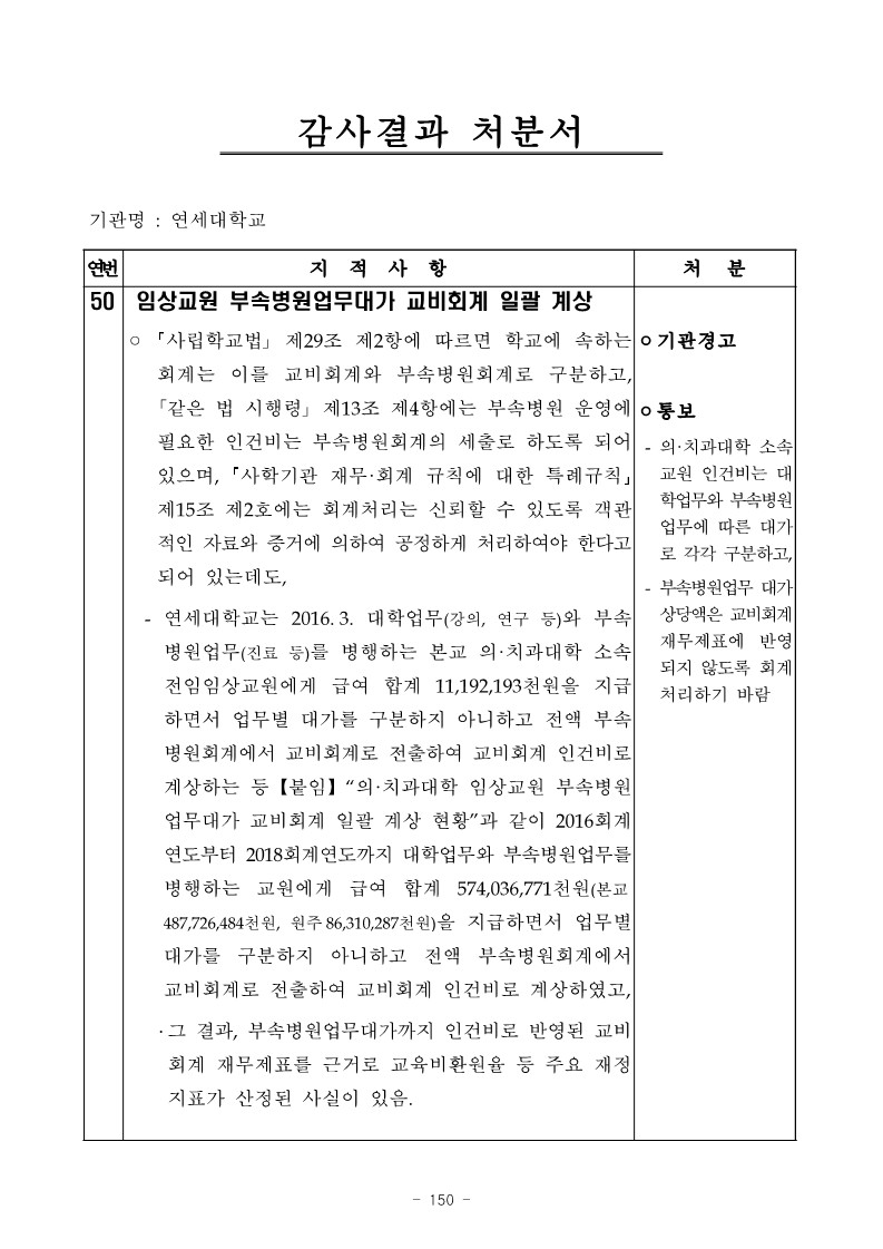 - 연세대학교는 2016. 3. 대학업무(강의, 연구 등)와 부속 병원업무(진료 등)를 병행하는 본교 의·치과대학 소속 전임임상교원에게 급여 합계 11,192,193천원을 지급 하면서 업무별 대가를 구분하지 아니하고 전액 부속 병원회계에서 교비회계로 전출하여 교비회계 인건비로 계상하는 등【붙임】“의·치과대학 임상교원 부속병원 업무대가 교비회계 일괄 계상 현황”과 같이 2016회계 연도부터 2018회계연도까지 대학업무와 부속병원업무를 병행하는 교원에게 급여 합계 574,036,771천원(본교 487,726,484천원, 원주86,310,287천원)을 지급하면서 업무별 대가를 구분하지 아니하고 전액 부속병원회계에서 교비회계로 전출하여 교비회계 인건비로 계상하였고 ․ 그 결과, 부속병원업무대가까지 인건비로 반영된 교비 회계 재무제표를 근거로 교육비환원율 등 주요 재정 지표가 산정된 사실이 있음.