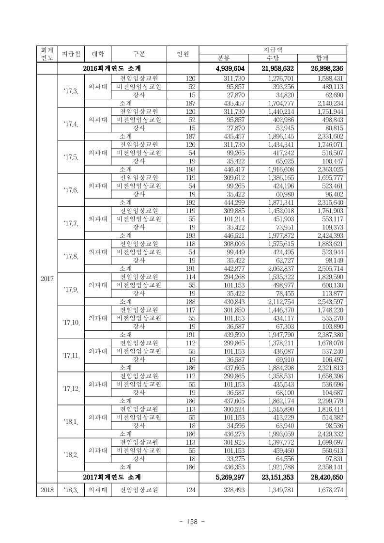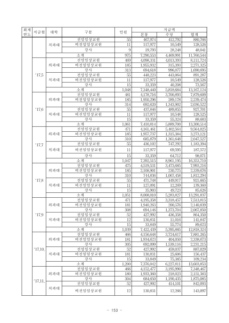 - 의·치과대학 소속 교원 인건비는 대학업무와부속병원 업무에 따른 대가 로 각각 구분하고