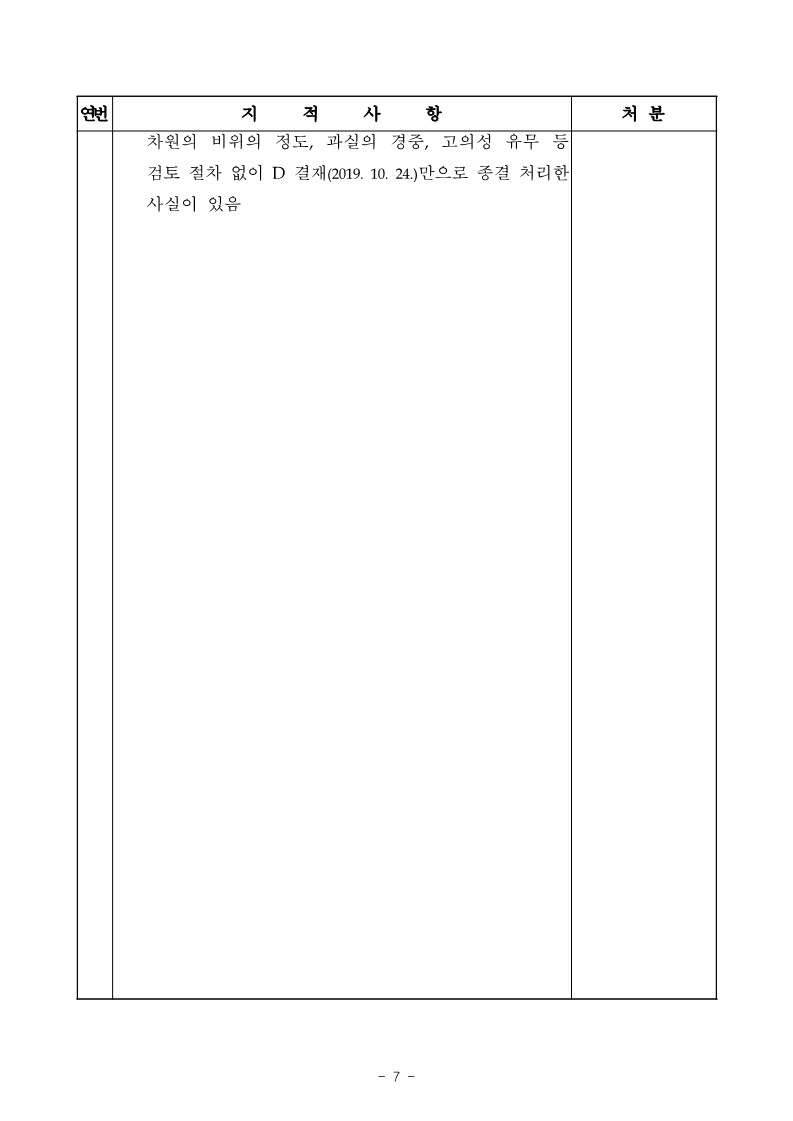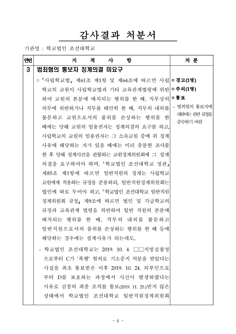 - 학교법인 조선대학교는 2019. 10. 4. □□지방검찰청 으로부터 C가 ‘폭행’ 혐의로 기소중지 처분을 받았다는 사실을 최초 통보받은 이후 2019. 10. 24. 외부인으로 부터 D를 보호하는 과정에서 사건이 발생하였다는 사유로 검찰의 최종 조치를 통보(2019. 11. 25.)받지 않은 상태에서 학교법인 조선대학교 일반직원징계위원회차원의 비위의 정도, 과실의 경중, 고의 유무 등 검토 절차 없이 D 결재(2019. 10. 24.)만으로 종결 처리한 사실이 있음
