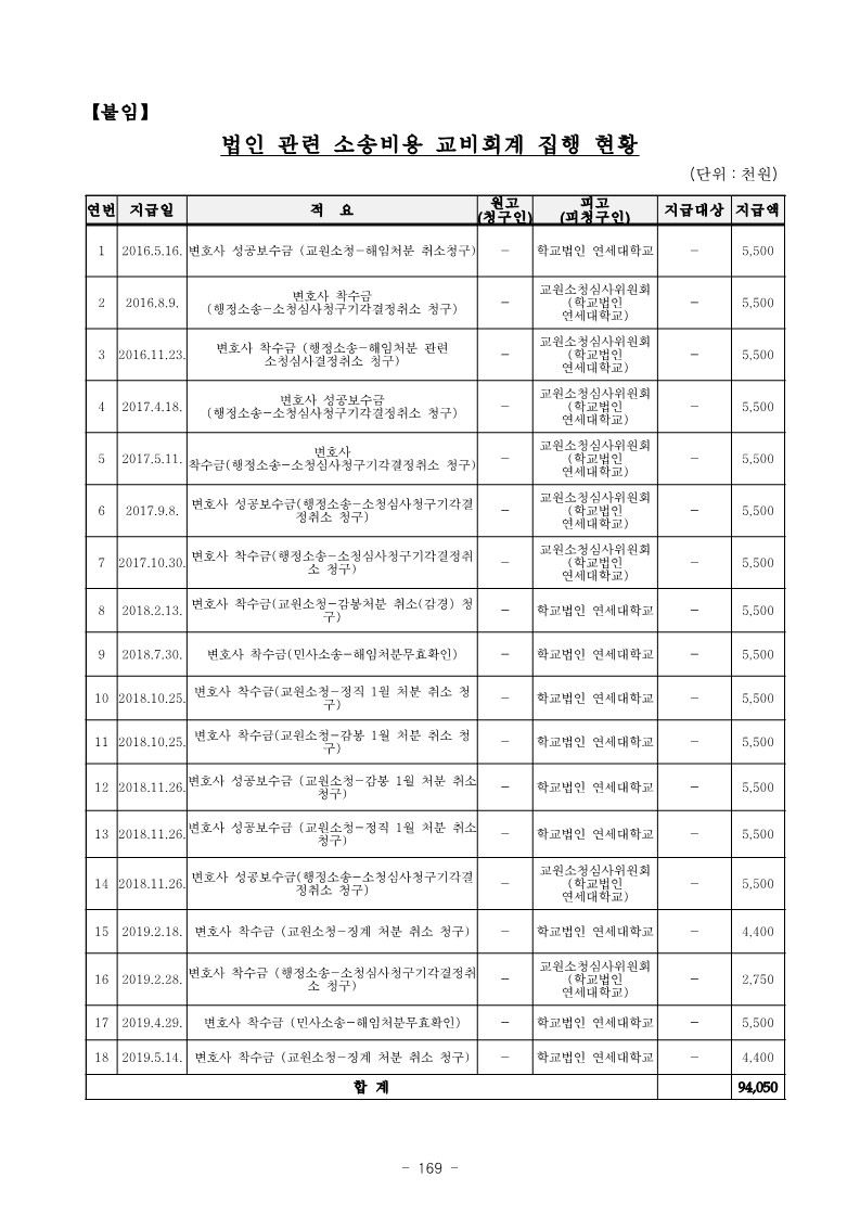 - 학교법인 연세대학교와 연세대학교는 2016. 5. 16. 법인 회계에서 집행해야 할 ‘교수 해임처분 취소청구 소청 관련 변호사 선임비용 5,500천원을 교비회계에서 집행하는 등 【붙임】 “법인 관련 소송비용 교비회계 집행 현황”과 같이 2016. 5.부터 2019. 5.까지 법인회계에서 집행해야 할 18건의 소송비용 합계 94,050천원을 교비회계에서 집행한 사실이 있음.
