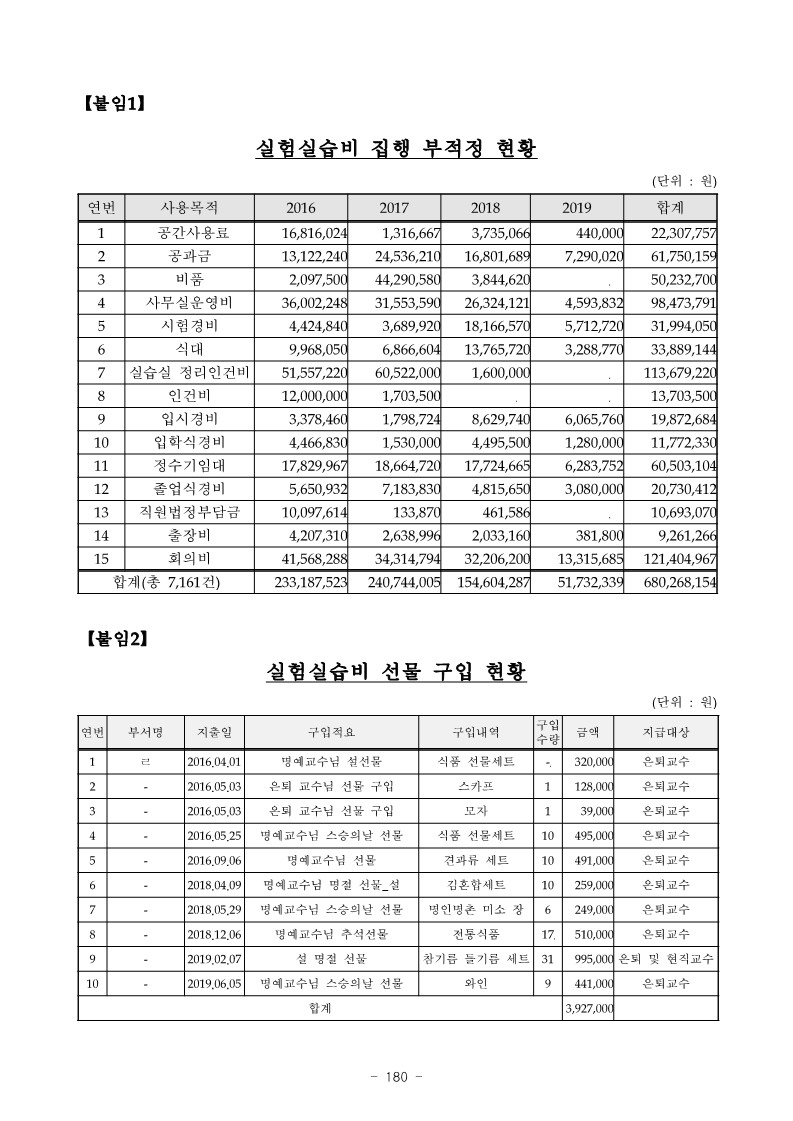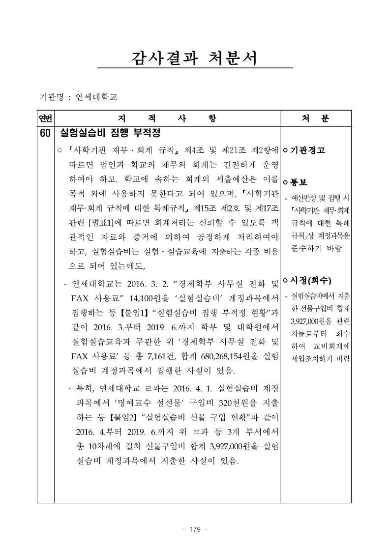 - 연세대학교는 2016. 3. 2. “경제학부 사무실 전화 및 FAX 사용료” 14,100원을 ‘실험실습비’ 계정과목에서 집행하는 등【붙임1】“실험실습비 집행 부적정 현황”과 같이 2016. 3.부터 2019. 6.까지 학부 및 대학원에서 실험실습교육과 무관한 위 ‘경제학부 사무실 전화 및 FAX 사용료’ 등 총 7,161건, 합계 680,268,154원을 실험 실습비 계정과목에서 집행한 사실이 있음.