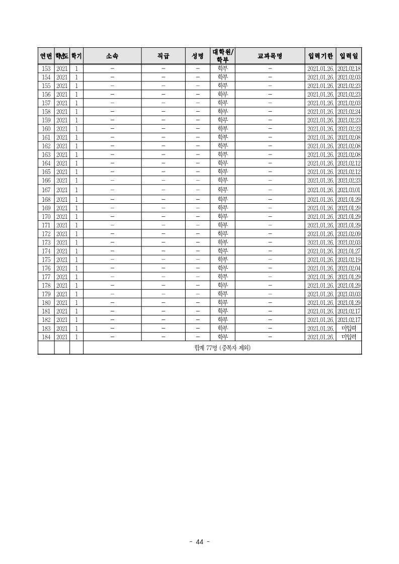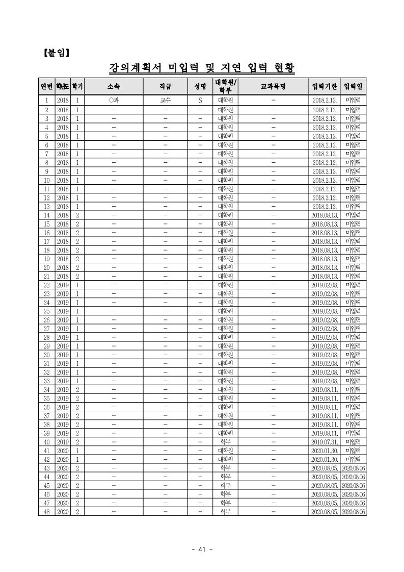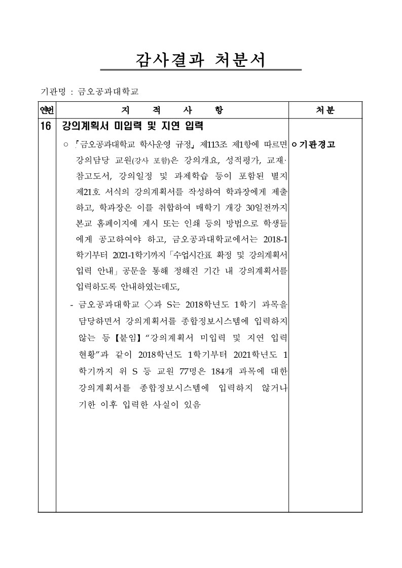 - 금오공과대학교 ◇과 S는 2018학년도 1학기 과목을 담당하면서 강의계획서를 종합정보시스템에 입력하지 않는 등【붙임】“강의계획서 미입력 및 지연 입력 현황”과 같이 2018학년도 1학기부터 2021학년도 학기까지 위 S 등 교원 77명은 184개 과목에 대한 강의계획서를 종합정보시스템에 입력하지 않거나 기한 이후 입력한 사실이 있음