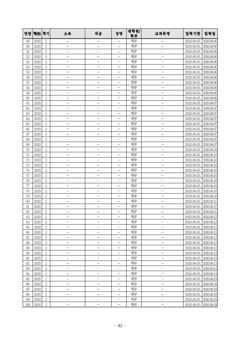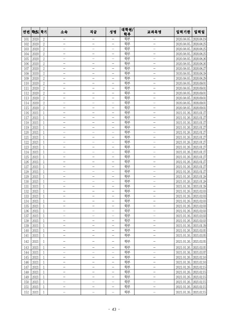 ◦ 「금오공과대학교 학사운영 규정」 제113조 제1항에 따르면 강의담당 교원(강사 포함)은 강의개요, 성적평가, 교재 참고도서, 강의일정 및 과제학습 등이 포함된 별지 제21호 서식의 강의계획서를 작성하여 학과장에게 제출 하고, 학과장은 이를 취합하여 매학기 개강 30일전까지 본교 홈페이지에 게시 또는 인쇄 등의 방법으로 학생들 에게 공고하여야 하고, 금오공과대학교에서는 2018-1 학기부터 2021-1학기까지「수업시간표 확정 및 강의계획서 입력 안내」공문을 통해 정해진 기간 내 강의계획서를 입력하도록 안내하였는데도,