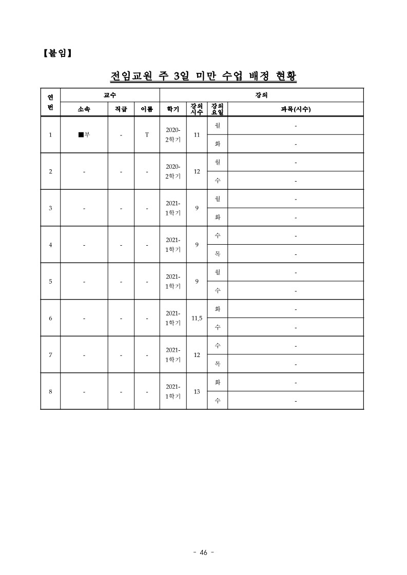 - 금오공과대학교는 ■부 T에게 2020학년도 2학기 강의를 배정하면서 주당 11시간 강의를 2일(월요일 4시간, 화요일 7시간)로 배정하는 등【붙임】“전임교원 주 3일 미만 수업 배정 현황”과 같이 2020학년도 2학기부터 2021 학년도 1학기까지 위 T 등 전임교원 8명에게 주당 3일 미만으로 강의시간을 배정한 사실이 있음.