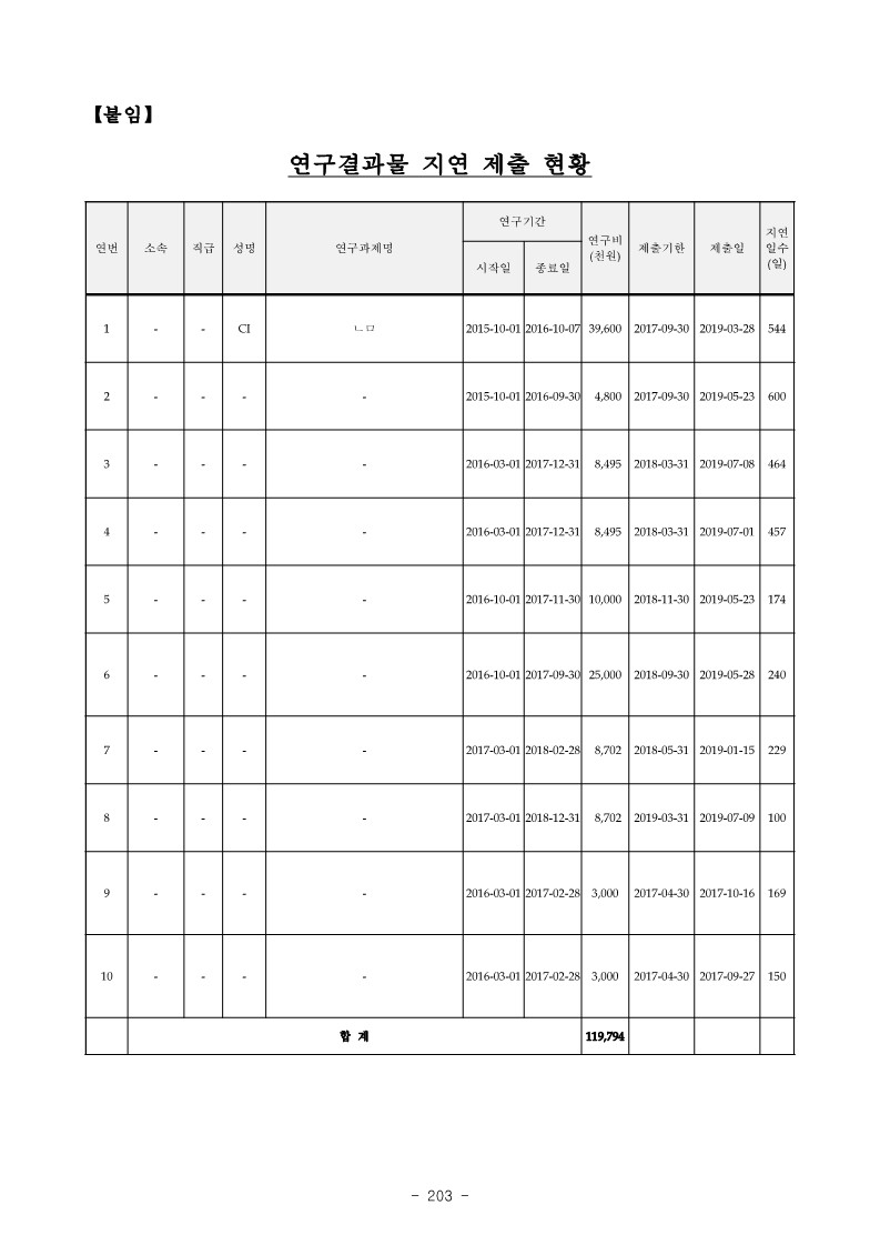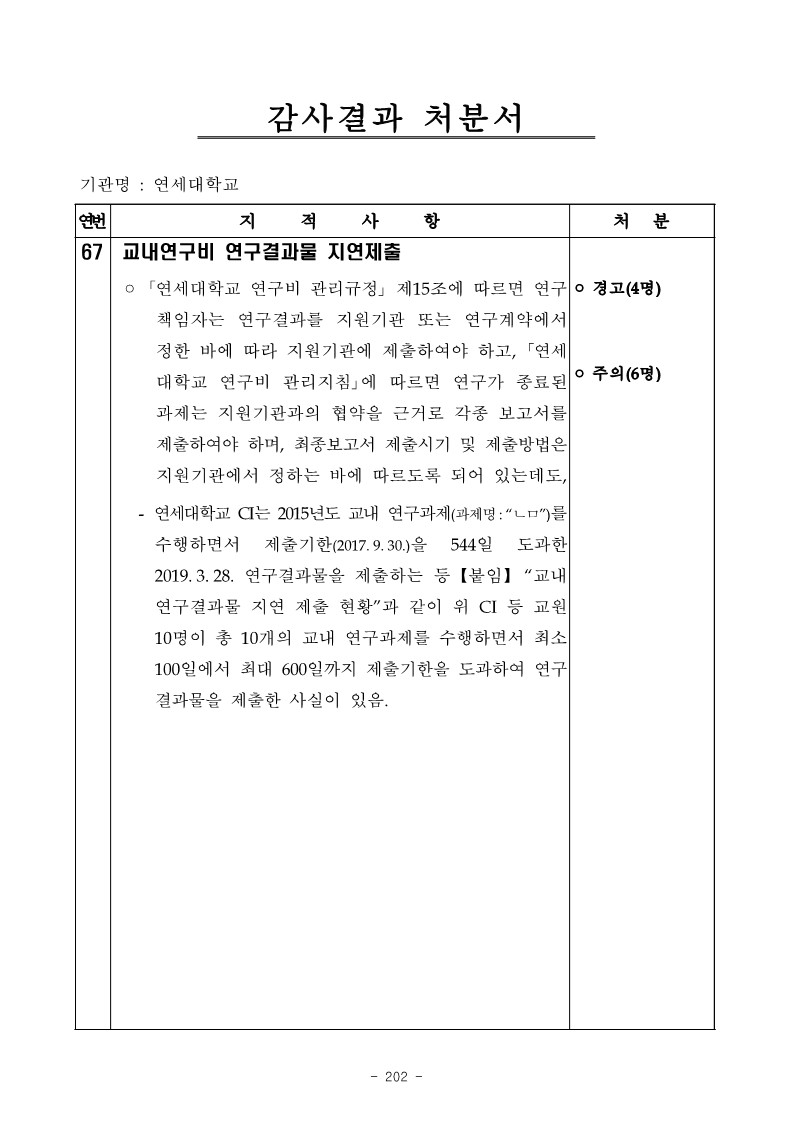 - 연세대학교 CI는 2015년도 교내 연구과제(과제명: “ㄴㅁ”)를 수행하면서 제출기한(2017. 9. 30.)을 544일 도과한 2019. 3. 28. 연구결과물을 제출하는 등【붙임】 “교내 연구결과물 지연 제출 현황”과 같이 위 CI 등 교원 10명이 총 10개의 교내 연구과제를 수행하면서 최소 100일에서 최대 600일까지 제출기한을 도과하여 연구 결과물을 제출한 사실이 있음.