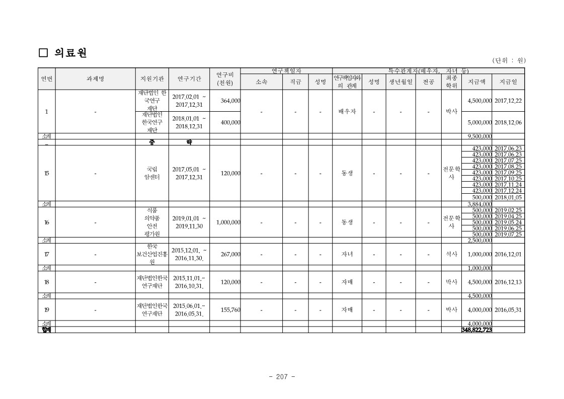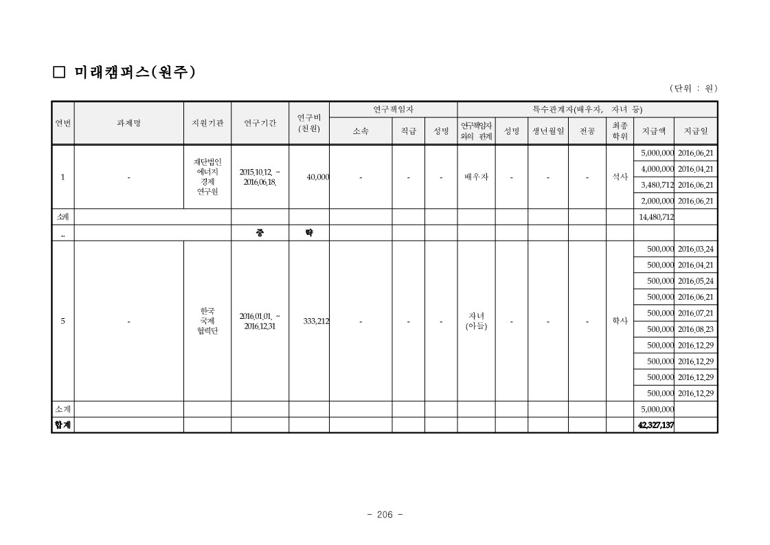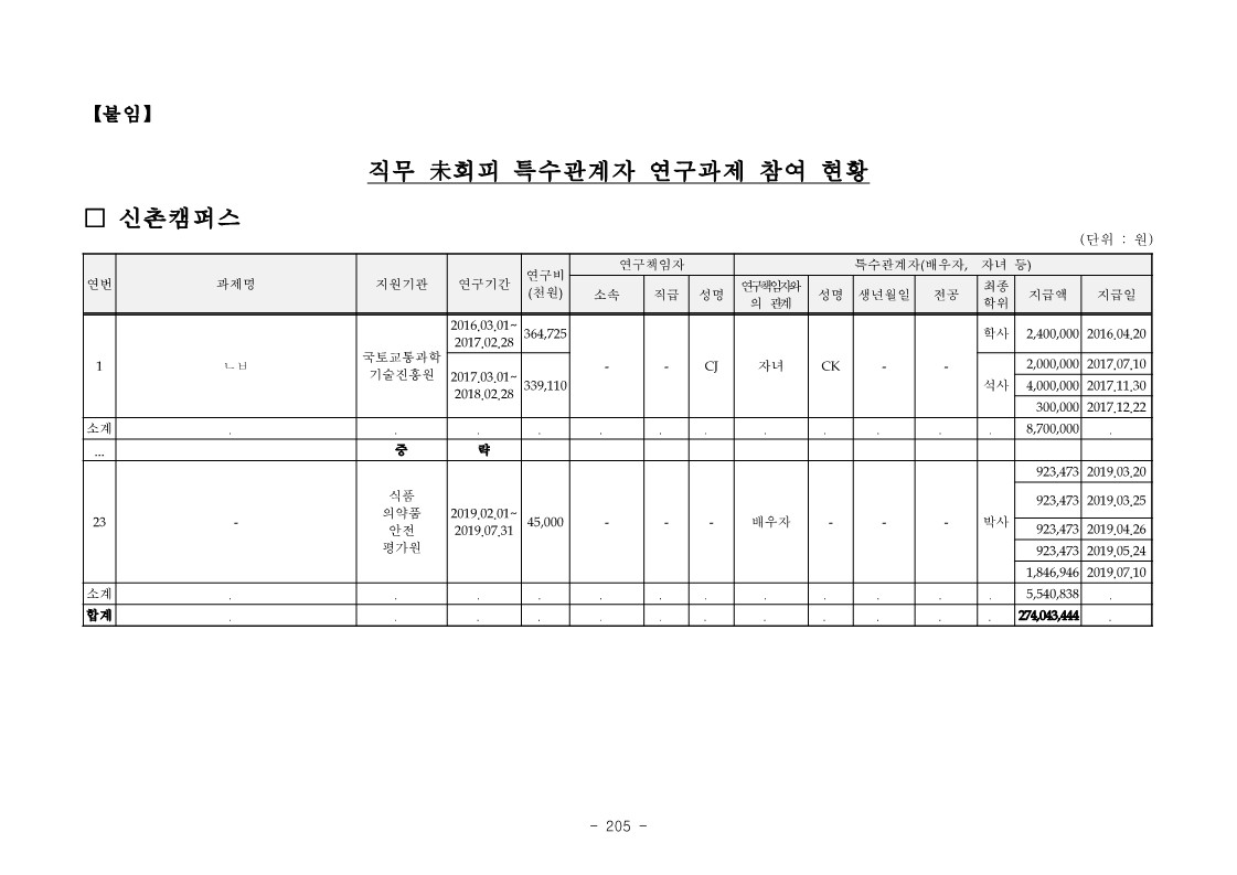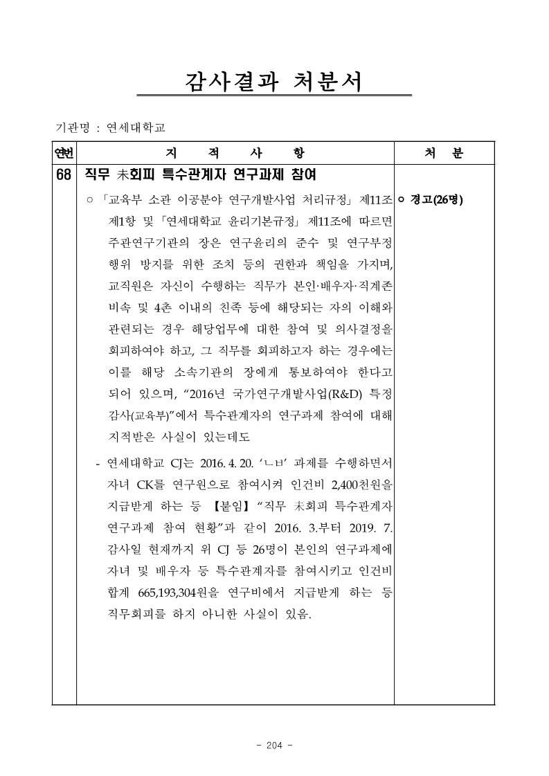 - 연세대학교 CJ는 2016. 4. 20. ‘ㄴㅂ’ 과제를 수행하면서 자녀 CK를 연구원으로 참여시켜 인건비 2,400천원을 지급받게 하는 등 【붙임】 “직무 未회피 특수관계자 연구과제 참여 현황”과 같이 2016. 3.부터 2019. 감사일 현재까지 위 CJ 등 26명이 본인의 연구과제에 자녀 및 배우자 등 특수관계자를 참여시키고 인건비 합계 665,193,304원을 연구비에서 지급받게 하는 등 직무회피를 하지 아니한 사실이 있음.