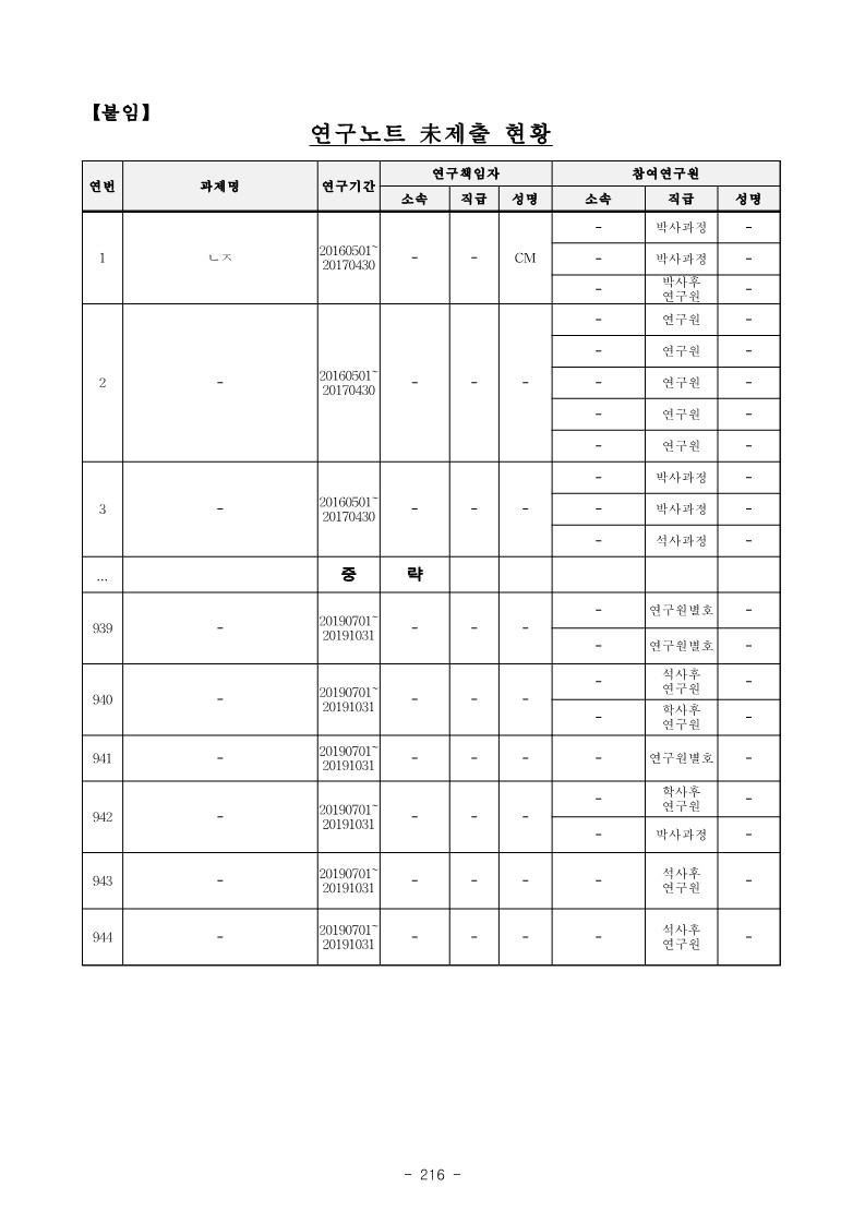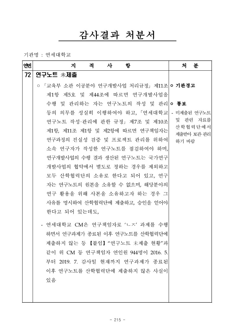 - 연세대학교 CM은 연구책임자로 ‘ㄴㅈ’ 과제를 수행 하면서 연구과제가 종료된 이후 연구노트를 산학협력단에 제출하지 않는 등【붙임】“연구노트 未제출 현황”과 같이 위 CM 등 연구책임자 연인원 944명이 2016. 5.부터 2019. 7. 감사일 현재까지 연구과제가 종료된 이후 연구노트를 산학협력단에 제출하지 않은 사실이 있음