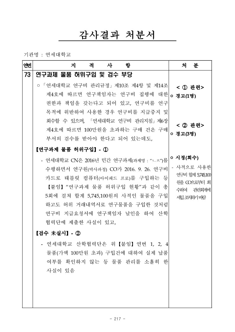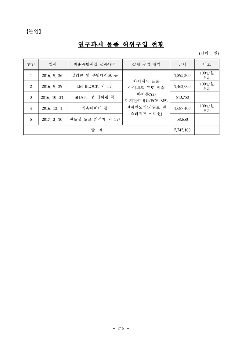 - 연세대학교 CN은 2016년 민간 연구과제(과제명 : “ㄴㅊ”)를 수행하면서 연구원(박사과정) CO가 2016. 9. 26. 연구비 카드로 태블릿 컴퓨터(아이패드 프로)를 구입하는 등 【붙임】“연구과제 물품 허위구입 현황”과 같이 총 5회에 걸쳐 합계 5,745,100원의 사적인 물품을 구입 하고도 허위 거래내역서로 연구물품을 구입한 것처럼 연구비 지급요청서에 연구책임자 날인을 하여 산학 협력단에 제출한 사실이 있고,