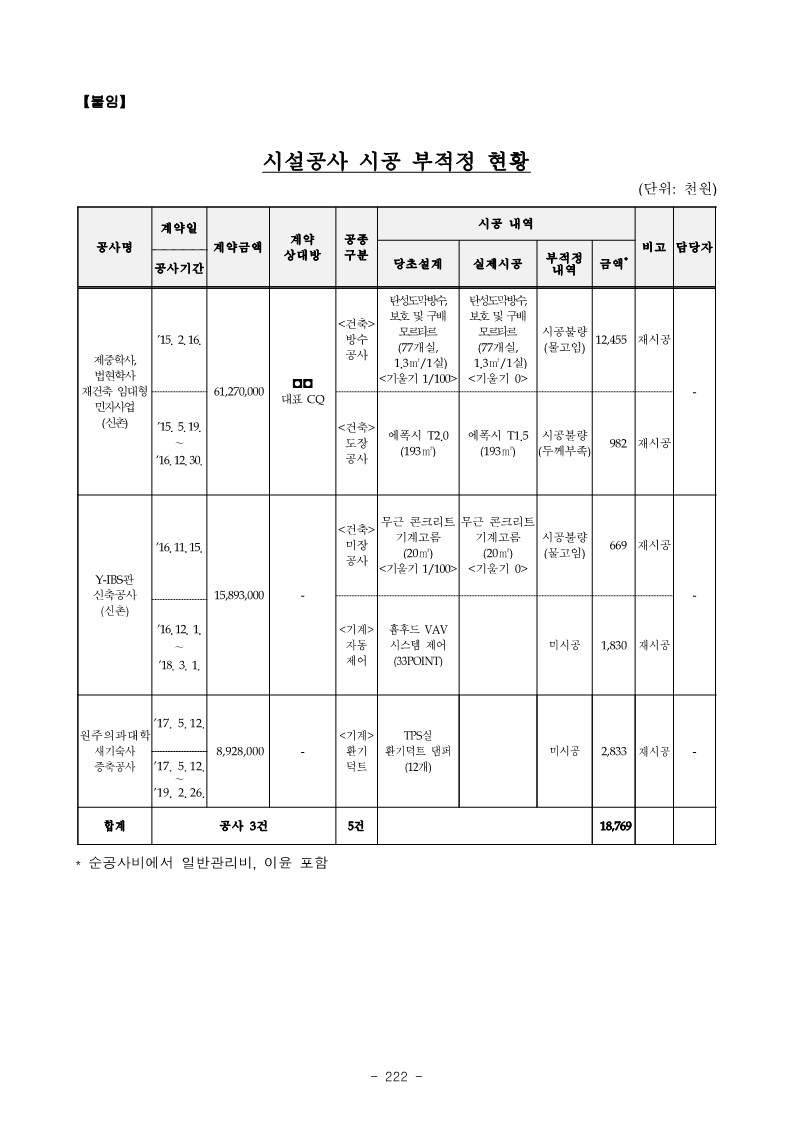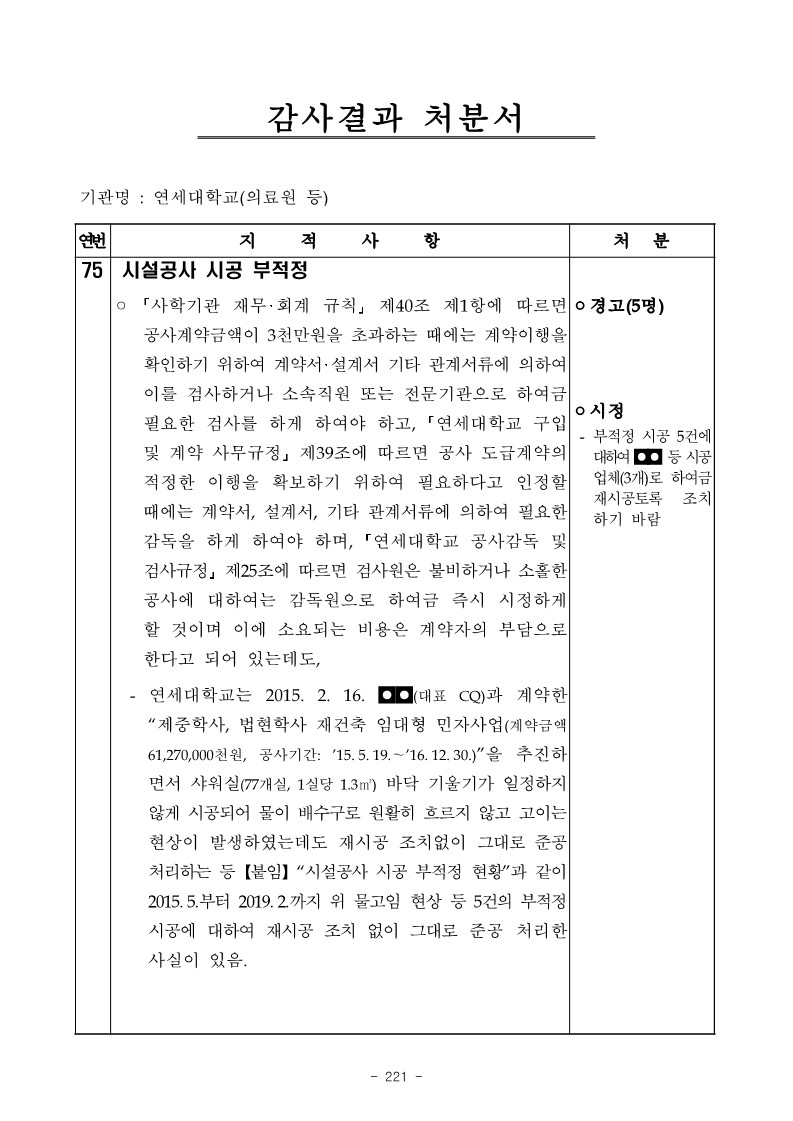 - 연세대학교는 2015. 2. 16. ◘◘(대표 CQ)과 계약한 “제중학사, 법현학사 재건축 임대형 민자사업(계약금액 61,270,000천원, 공사기간: ’15. 5. 19.∼’16. 12. 30.)”을 추진하 면서 샤워실(77개실, 1실당 1.3㎡) 바닥 기울기가 일정하지 않게 시공되어 물이 배수구로 원활히 흐르지 않고 고이는 현상이 발생하였는데도 재시공 조치없이 그대로 준공 처리하는 등【붙임】“시설공사 시공 부적정 현황”과 같이 2015. 5.부터 2019. 2.까지 위 물고임 현상 등 5건의 부적정 시공에 대하여 재시공 조치 없이 그대로 준공 처리한 사실이 있음.