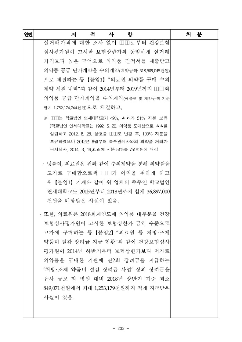 · 덧붙여, 의료원은 위와 같이 수의계약을 통해 의약품을 고가로 구매함으로써 ◫◫가 이익을 취하게 하고 위【붙임1】기재와 같이 위 업체의 주주인 학교법인 연세대학교도 2015년부터 2018년까지 합계 36,897,000 천원을 배당받은 사실이 있음.