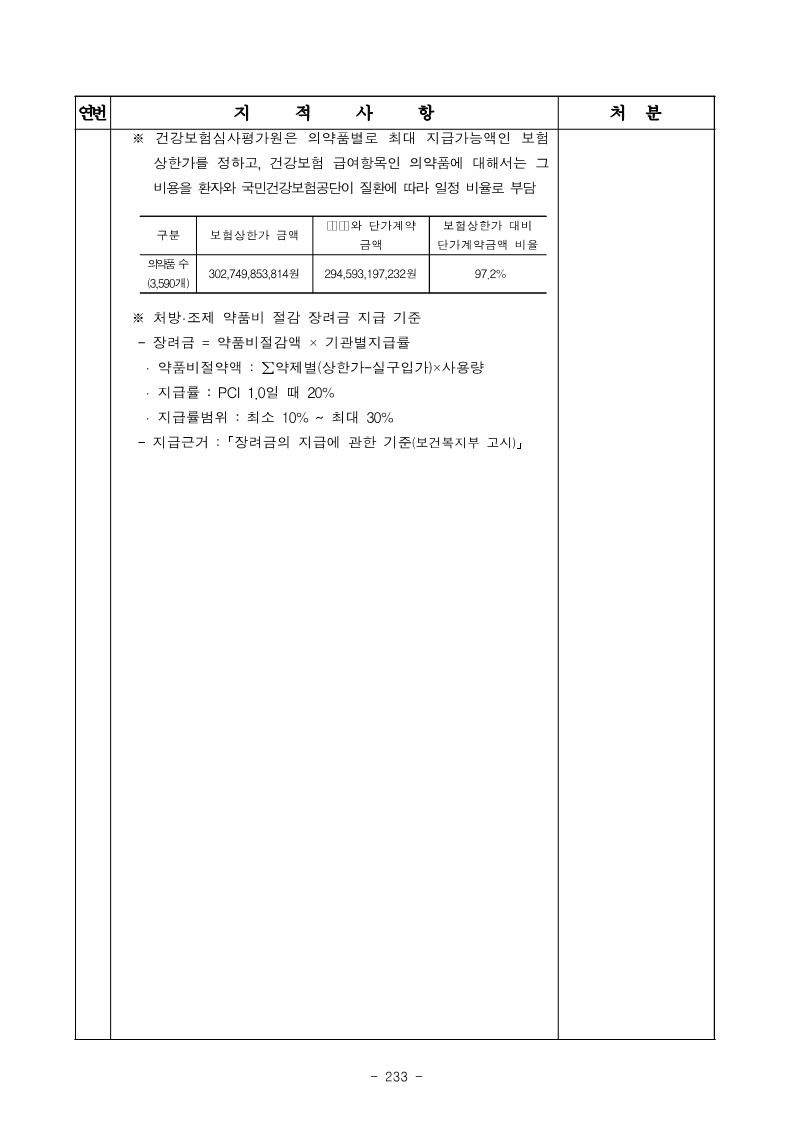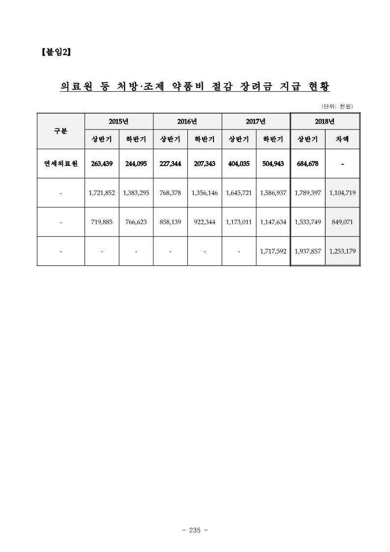 - 또한, 의료원은 2018회계연도에 의약품 대부분을 건강 보험심사평가원이 고시한 보험상한가 금액 수준으로 고가에 구매하는 등【붙임2】“의료원 등 처방·조제 약품비 절감 장려금 지급 현황”과 같이 건강보험심사 평가원이 2014년 하반기부터 보험상한가보다 저가로 의약품을 구매한 기관에 연2회 장려금을 지급하는 ‘처방·조제 약품비 절감 장려금 사업’ 상의 장려금을 유사 규모 타 병원 대비 2018년 상반기 기준 최소 849,071천원에서 최대 1,253,179천원까지 적게 지급받은 사실이 있음.