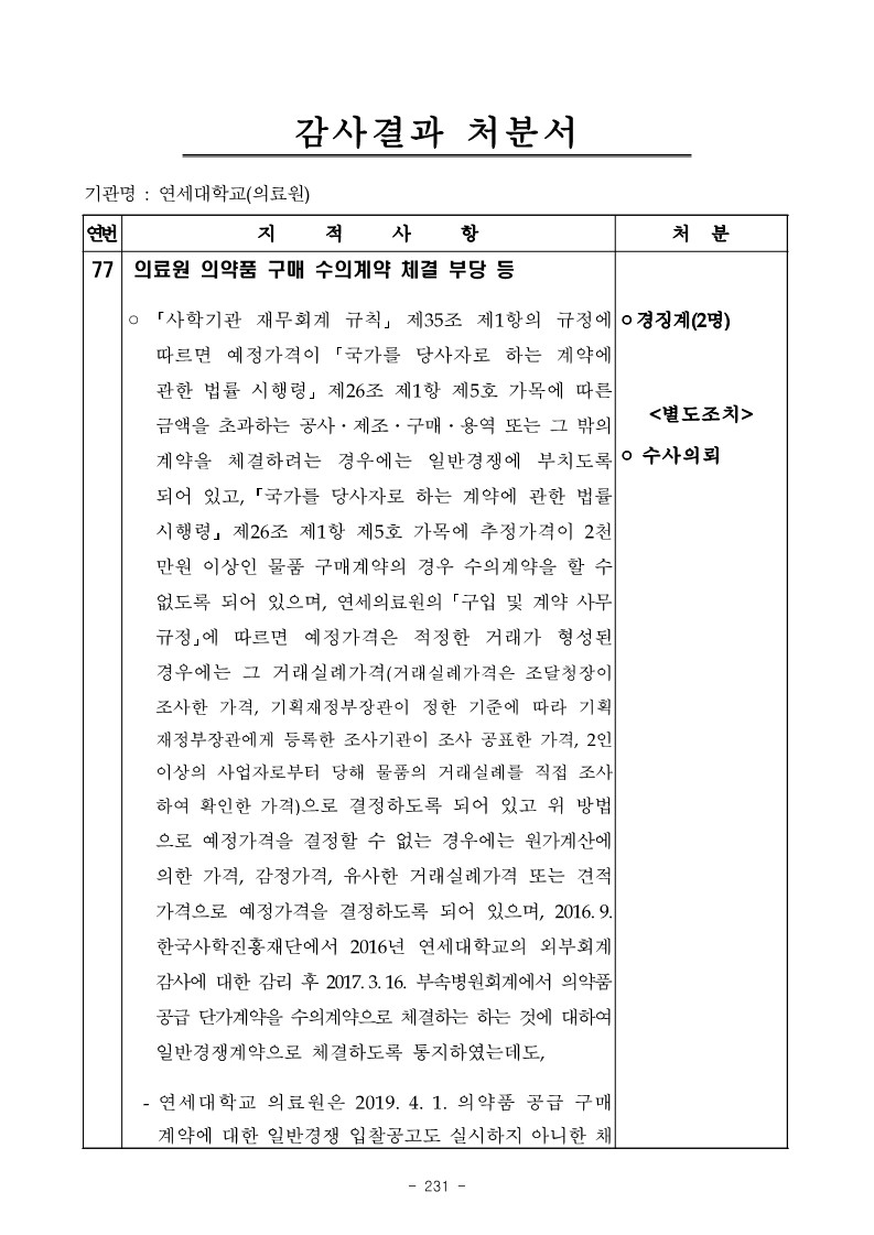 ◦ 사학기관 재무회계 규칙 제35조 제1항의 규정에 따르면 예정가격이 국가를 당사자로 하는 계약에 관한 법률 시행령 제26조 제1항 제5호 가목에 따른 금액을 초과하는 공사ㆍ제조ㆍ구매ㆍ용역 또는 그 밖의 계약을 체결하려는 경우에는 일반경쟁에 부치도록 되어 있고, 국가를 당사자로 하는 계약에 관한 법률 시행령 제26조 제1항 제5호 가목에 추정가격이 2천 만원 이상인 물품 구매계약의 경우 수의계약을 할 수 없도록 되어 있으며, 연세의료원의 구입 및 계약 사무 규정 에 따르면 예정가격은 적정한 거래가 형성된 경우에는 그 거래실례가격(거래실례가격은 조달청장이 조사한 가격, 기획재정부장관이 정한 기준에 따라 기획 재정부장관에게 등록한 조사기관이 조사 공표한 가격, 2인 이상의 사업자로부터 당해 물품의 거래실례를 직접 조사 하여 확인한 가격)으로 결정하도록 되어 있고 위 방법 으로 예정가격을 결정할 수 없는 경우에는 원가계산에 의한 가격, 감정가격, 유사한 거래실례가격 또는 견적 가격으로 예정가격을 결정하도록 되어 있으며, 2016. 9.한국사학진흥재단에서 2016년 연세대학교의 외부회계 감사에대한감리후2017.3.16. 부속병원회계에서의약품 공급단가계약을수의계약으로체결하는하는것에대하여 일반경쟁계약으로 체결하도록 통지하였는데도,