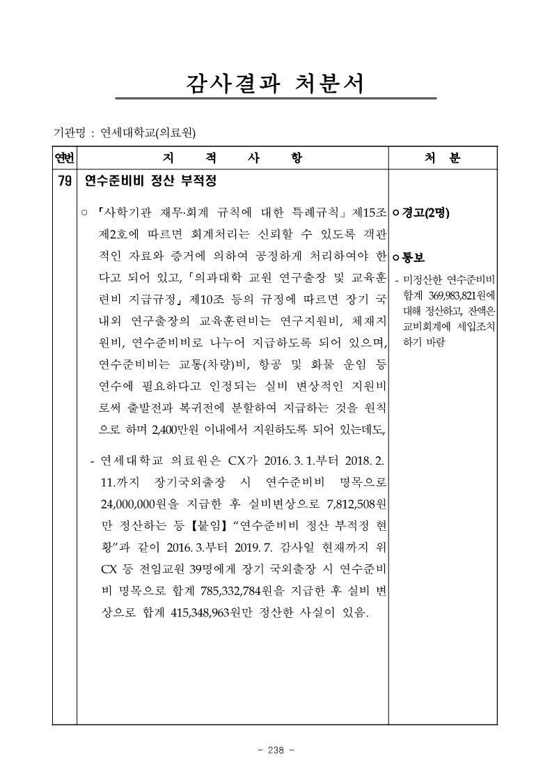 - 연세대학교 의료원은 CX가 2016. 3. 1.부터 2018. 2. 11.까지 장기국외출장 시 연수준비비 명목으로 24,000,000원을 지급한 후 실비변상으로 7,812,508원 만 정산하는 등【붙임】“연수준비비 정산 부적정 현 황”과 같이 2016. 3.부터 2019. 7. 감사일 현재까지 위 CX 등 전임교원 39명에게 장기 국외출장 시 연수준비 비 명목으로 합계 785,332,784원을 지급한 후 실비 변 상으로 합계 415,348,963원만 정산한 사실이 있음.