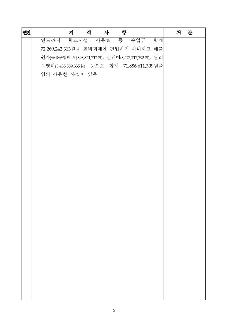 수입금 합계 24,836,358,920원을 교비회계에 편입하지 아니하는 등 【붙임】“생활협동조합 수입금 교비회계 未편입 현황”과 같이 2016회계연도부터 2018회계연도까지 학교시설 사용료 등 수입금 합계 72,269,242,313원을 교비회계에 편입하지 아니하고 매출 원가(물품구입비 50,898,821,712원), 인건비(8,475,717,793원), 관리 운영비(3,435,589,335원) 등으로 합계 71,886,611,309원을 임의 사용한 사실이 있음