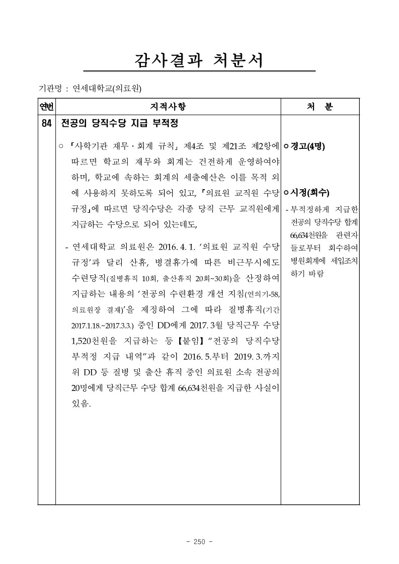 - 연세대학교 의료원은 2016. 4. 1. ‘의료원 교직원 수당 규정’과 달리 산휴, 병결휴가에 따른 비근무시에도 수련당직(질병휴직 10회, 출산휴직 20회~30회)을 산정하여 지급하는 내용의 ‘전공의 수련환경 개선 지침(연의기-58, 의료원장 결재)’을 제정하여 그에 따라 질병휴직(기간 2017.1.18.~2017.3.3.) 중인 DD에게 2017. 3월 당직근무 수당 1,520천원을 지급하는 등【붙임】“전공의 당직수당 부적정 지급 내역”과 같이 2016. 5.부터 2019. 3.까지 위 DD 등 질병 및 출산 휴직 중인 의료원 소속 전공의 20명에게 당직근무 수당 합계 66,634천원을 지급한 사실이 있음.