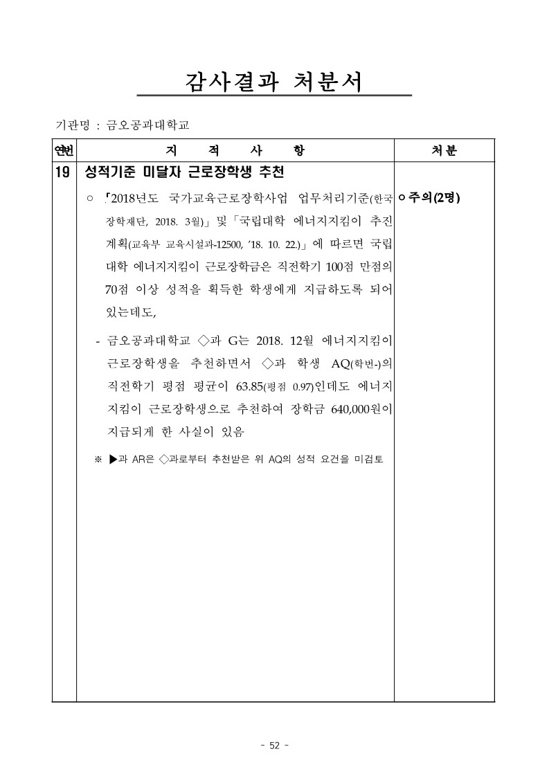 - 금오공과대학교 ◇과 G는 2018. 12월 에너지지킴이 근로장학생을 추천하면서 ◇과 학생 AQ(학번-)의 직전학기 평점 평균이 63.85(평점 0.97)인데도 에너지 지킴이 근로장학생으로 추천하여 장학금 640,000원이 지급되게 한 사실이 있음