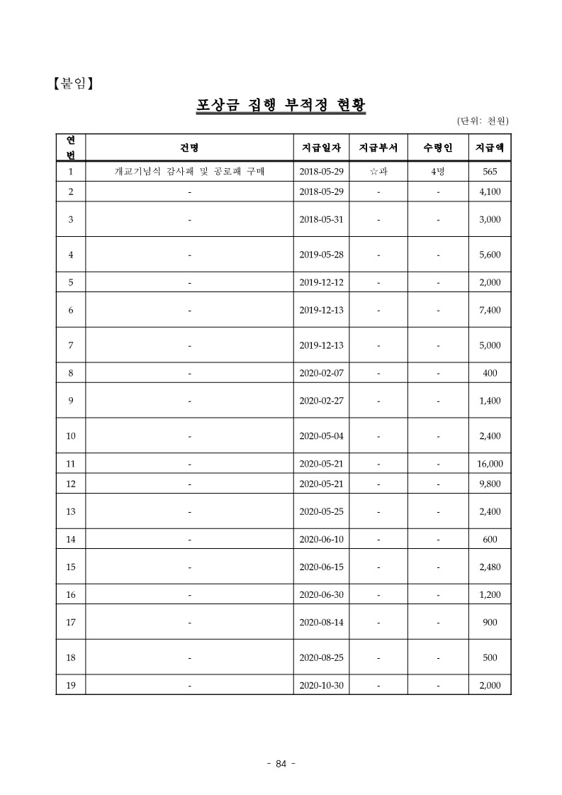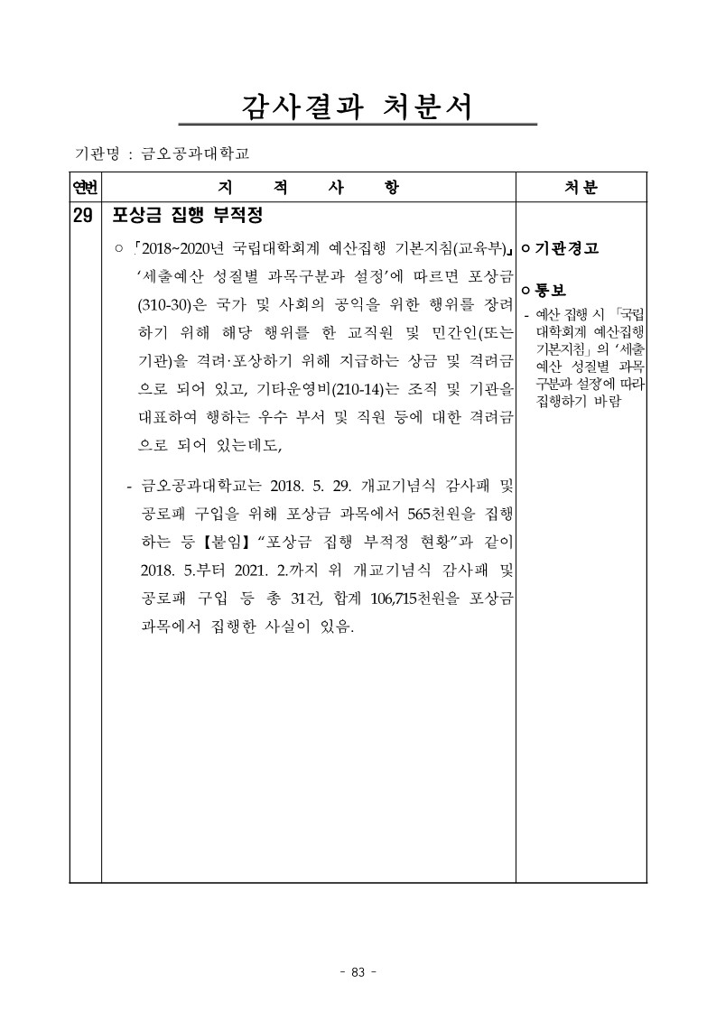 - 금오공과대학교는 2018. 5. 29. 개교기념식 감사패 및 공로패 구입을 위해 포상금 과목에서 565천원을 집행 하는 등【붙임】“포상금 집행 부적정 현황”과 같이 2018. 5.부터 2021. 2.까지 위 개교기념식 감사패 및 공로패 구입 등 총 31건, 합계 106,715천원을 포상금 과목에서 집행한 사실이 있음.