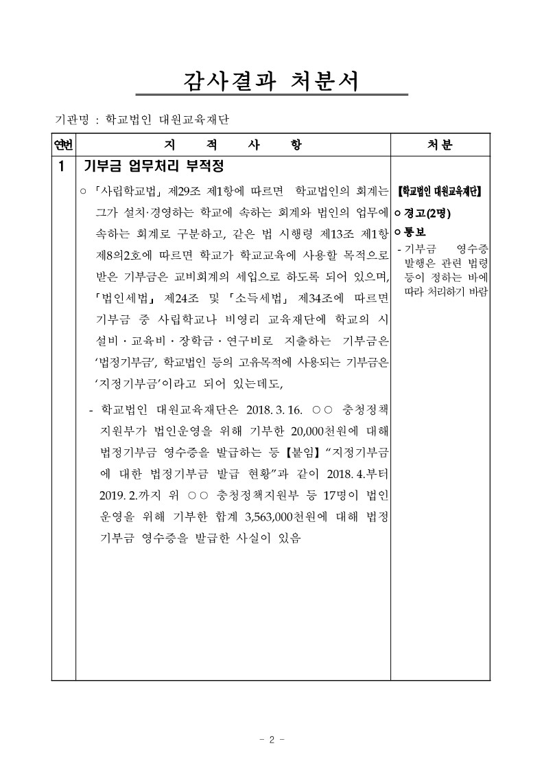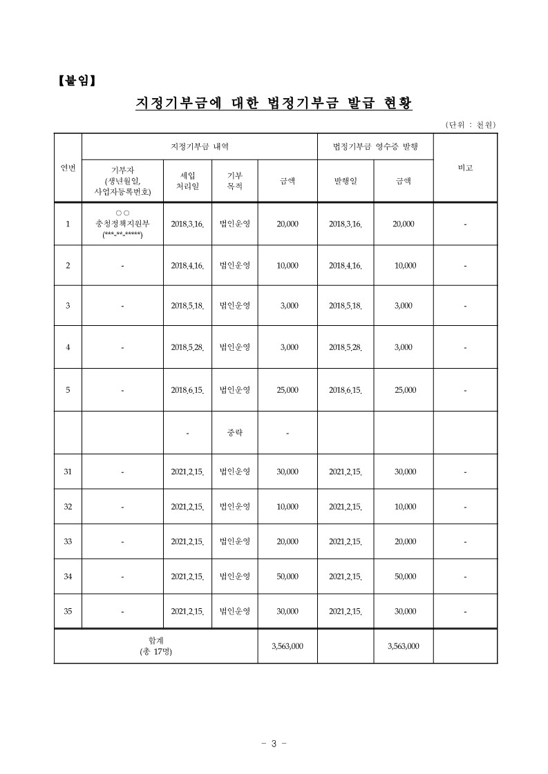 - 학교법인 대원교육재단은 2018. 3. 16. ○○ 충청정책 지원부가 법인운영을 위해 기부한 20,000천원에 대해 법정기부금 영수증을 발급하는 등【붙임】“지정기부금 에 대한 법정기부금 발급 현황”과 같이 2018. 4.부터 2019. 2.까지 위 ○○ 충청정책지원부 등 17명이 법인 운영을 위해 기부한 합계 3,563,000천원에 대해 법정 기부금 영수증을 발급한 사실이 있음