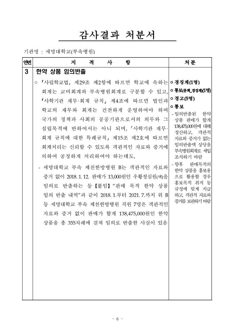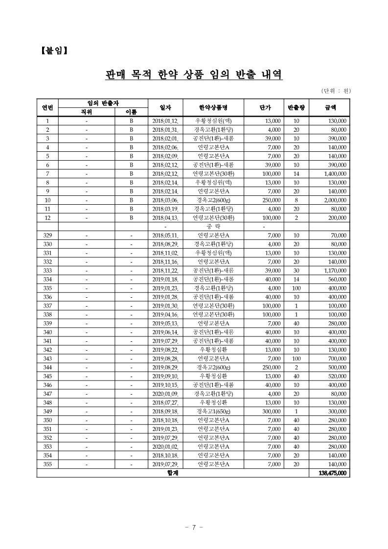 - 세명대학교 부속 제천한방병원 B는 객관적인 자료와 증거 없이 2018. 1. 12. 판매가 13,000원인 우황청심원(액)을 임의로 반출하는 등【붙임】“판매 목적 한약 상품 임의 반출 내역”과 같이 2018. 1.부터 2021. 7.까지 위 B 등 세명대학교 부속 제천한방병원 직원 7명은 객관적인 자료와 증거 없이 판매가 합계 138,475,000원인 한약 상품을 총 355차례에 걸쳐 임의로 반출한 사실이 있음