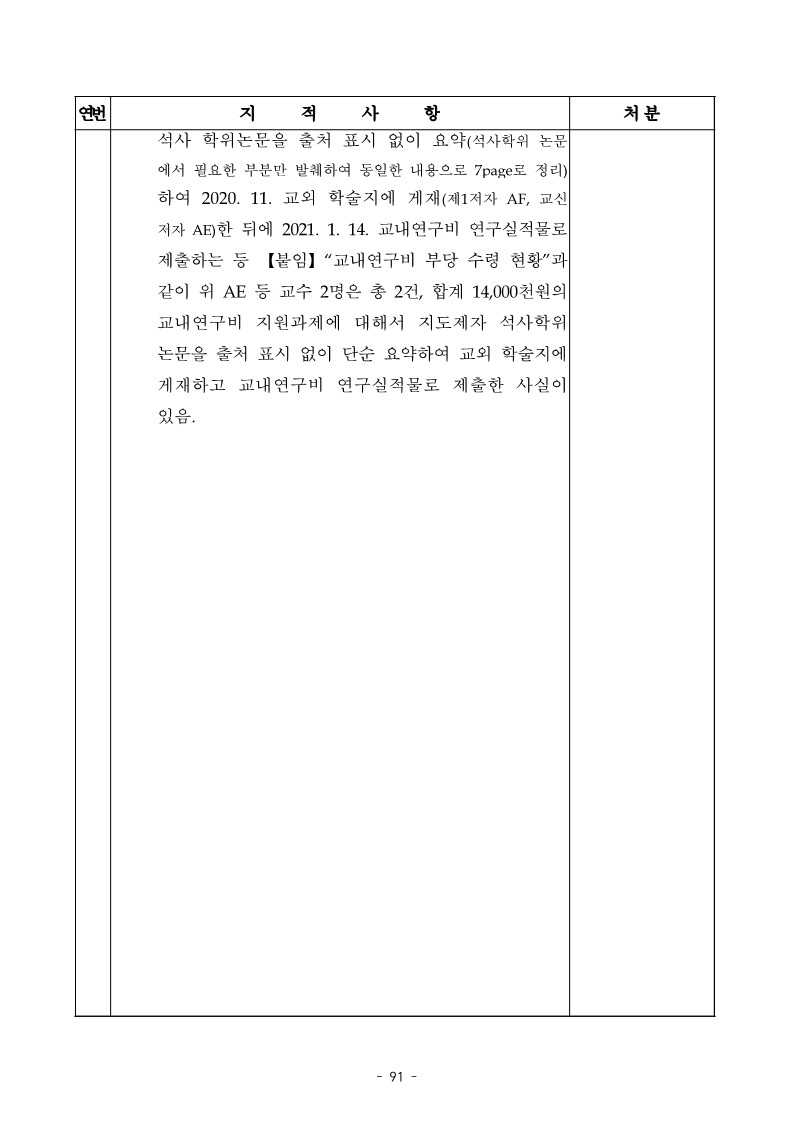- 금오공과대학교 ★과 교수 AE(AF의 지도교수)는 2018. 5. 1. 연구과제로 교내연구비 지원을 신청하여 지원받고, 2017. 12. 발표된 제자 AF(지도교수 AE)의 석사 학위논문을 출처 표시 없이 요약(석사학위 논문 에서 필요한 부분만 발췌하여 동일한 내용으로 7page로 정리 하여 2020. 11. 교외 학술지에 게재(제1저자 AF, 교신 저자 AE)한 뒤에 2021. 1. 14. 교내연구비 연구실적물로 제출하는 등 【붙임】“교내연구비 부당 수령 현황”과 같이 위 AE 등 교수 2명은 총 2건, 합계 14,000천원의 교내연구비 지원과제에 대해서 지도제자 석사학위 논문을 출처 표시 없이 단순 요약하여 교외 학술지에 게재하고 교내연구비 연구실적물로 제출한 사실이 있음.