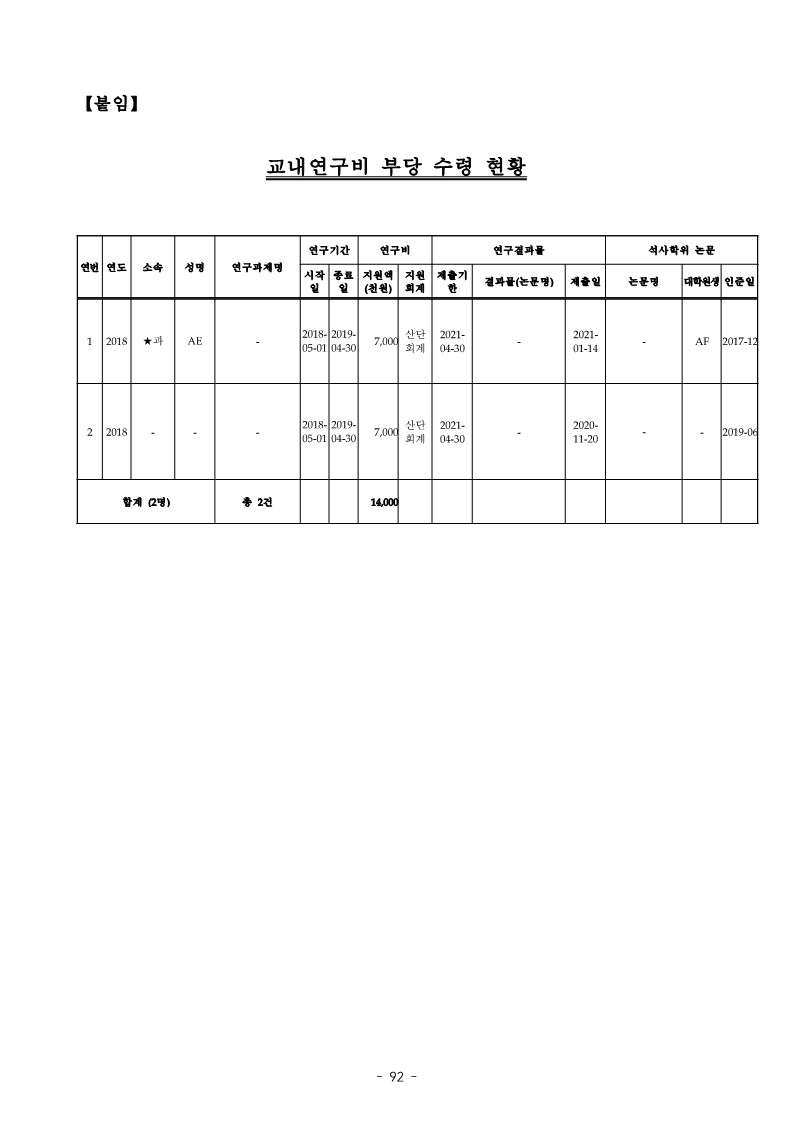 -연구비를부당하게 지원받은 AE 등 2명으로부터 합계 14,000천원을 회수하여 관련 회계에 세입조치 하기 바람