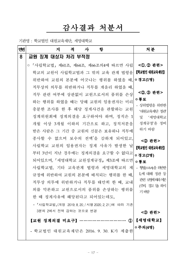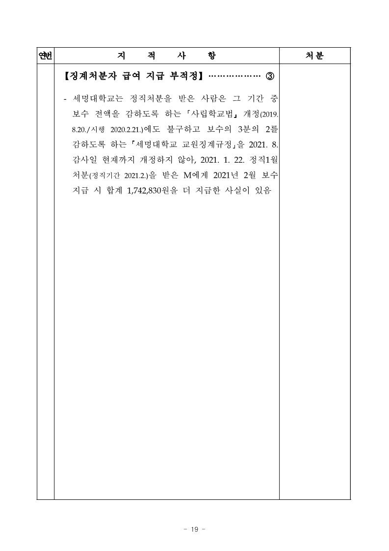 - 세명대학교는 정직처분을 받은 사람은 그 기간 중 보수 전액을 감하도록 하는 사립학교법 개정(2019. 8.20./시행 2020.2.21.)에도 불구하고 보수의 3분의 2를 감하도록 하는 세명대학교 교원징계규정 을 2021. 감사일 현재까지 개정하지 않아, 2021. 1. 22. 정직1월 처분(정직기간 2021.2.)을 받은 M에게 2021년 2월 보수 지급 시 합계 1,742,830원을 더 지급한 사실이 있음