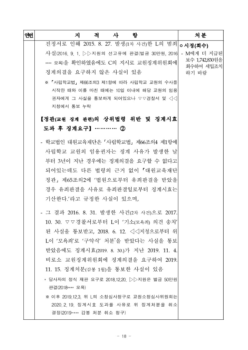 ※ 이후 2019.12.3. 위 L의 소청심사청구로 교원소청심사위원회는 2020. 2. 19. 징계시효 도과를 사유로 위 징계처분을 취소 결정(2019-*** 감봉 처분 취소 청구)