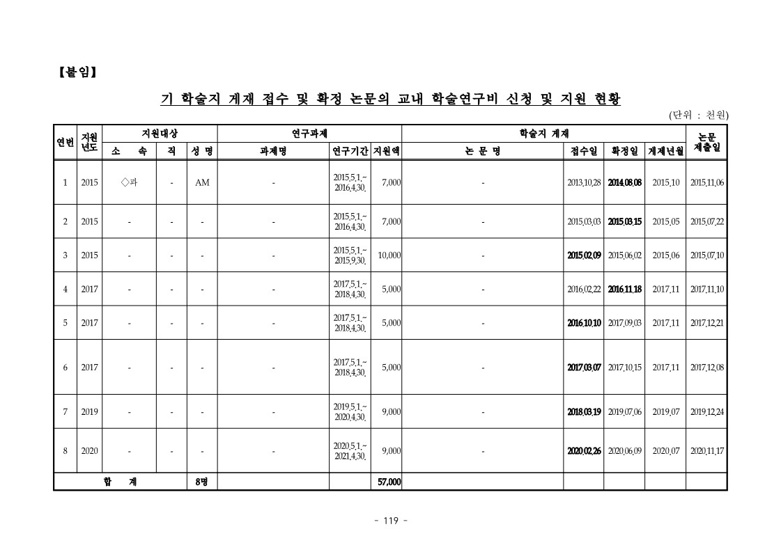 - 금오공과대학교 ◇과 AM은 2015년 연구과제의 연구비를 신청하여 연구비 7,000천원을 지급받고, 2014. 8. 8.학술지에 게재가 이미 확정된 논문을 2015. 11. 6.연구결과물로 제출하는 등 【붙임】 “기 학술지 게재 접수 및 확정 논문의 교내 학술연구비 신청 및 지원 현황”과 같이 2015년부터 2020년까지 연구비를 지급 받은 위 AM 등 교원 8명은 해당 연구과제의 연구 기간 시작일 전 이미 학술지에 게재 접수하거나 게재 확정된 논문을 연구결과물로 제출한 사실이 있고,