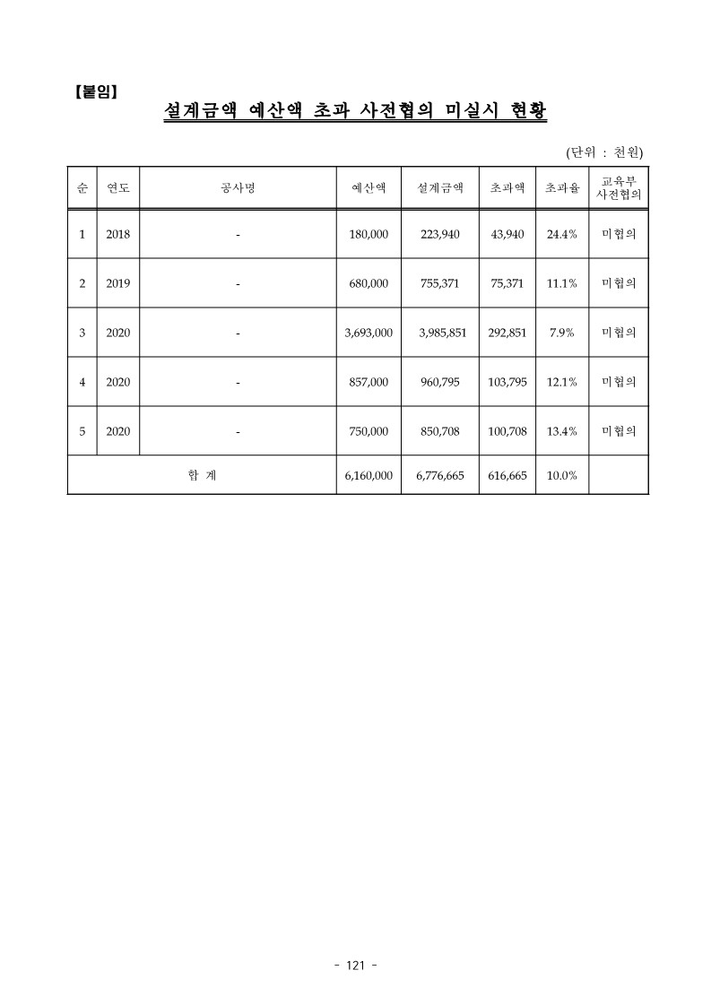 - 금오공과대학교는 2018년도 전기공사의 설계금액을 교육부장관과 사전협의 없이 예산액 180,000천원 보다 43,940천원을 초과(초과율 24.4%)하여 실시설계하는 등【붙임】“설계금액 예산액 초과 사전협의 미실시 현황”과 같이 2018년도부터 2020년도까지 5건의 설계 금액을 교육부장관과 사전협의 없이 예산액 보다 합계 616,665천원을 초과(초과율 평균 10.0%)하여 실시 설계한 사실이 있음