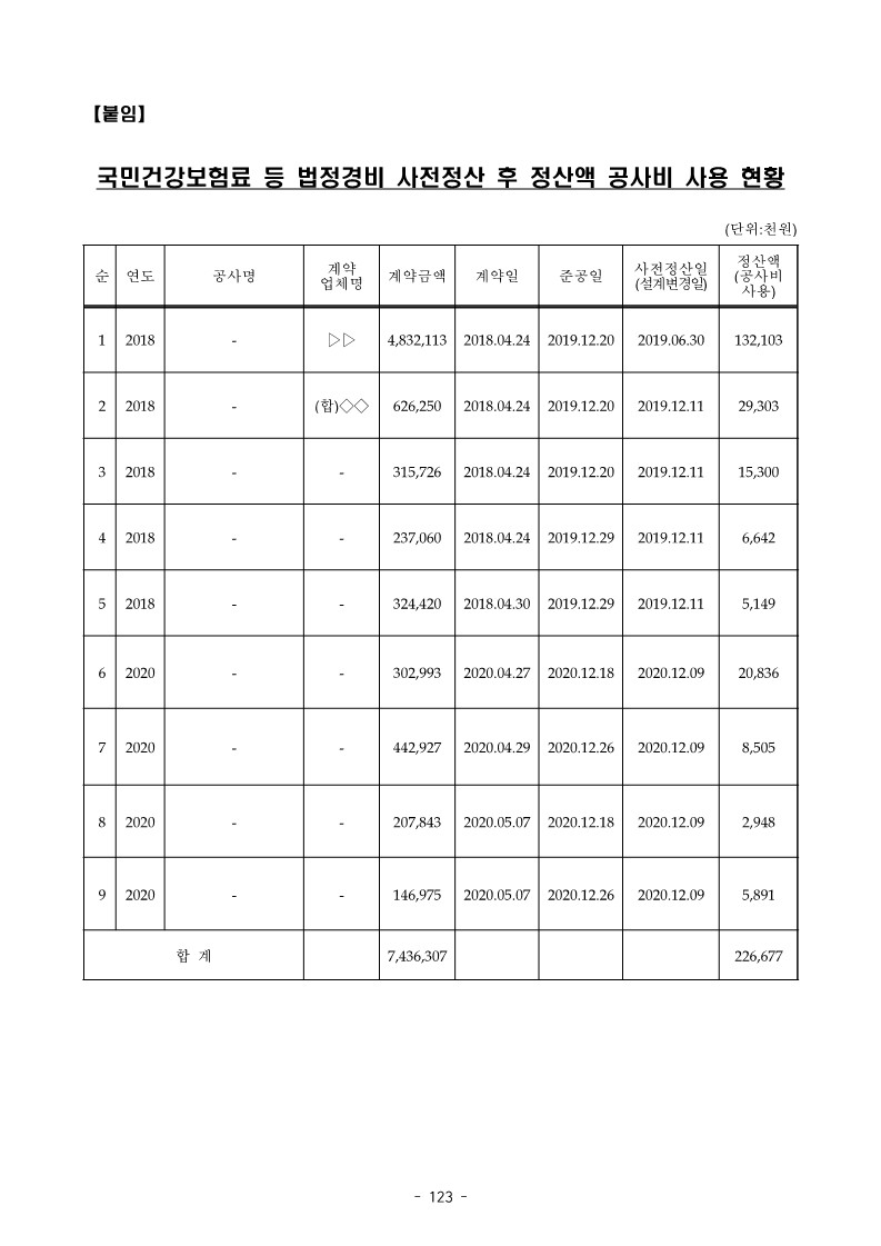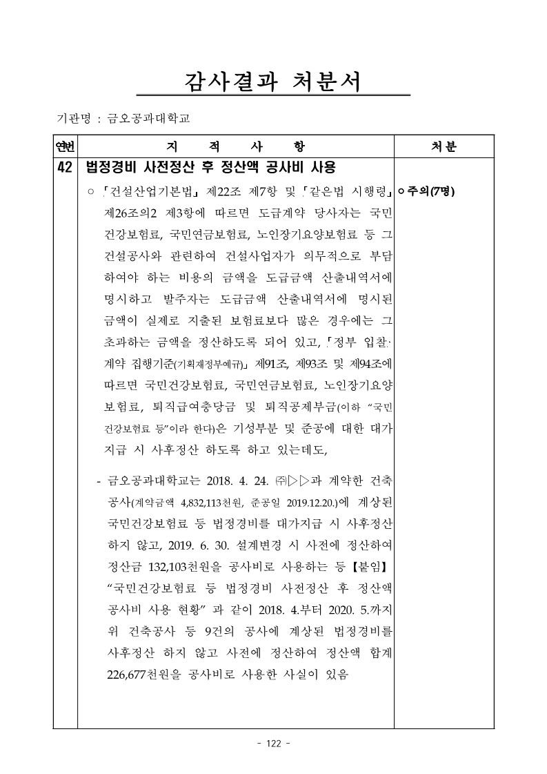 - 금오공과대학교는 2018. 4. 24. ㈜▷▷과 계약한 건축 공사(계약금액 4,832,113천원, 준공일 2019.12.20.)에 계상된 국민건강보험료 등 법정경비를 대가지급 시 사후정산 하지 않고, 2019. 6. 30. 설계변경 시 사전에 정산하여 정산금 132,103천원을 공사비로 사용하는 등【붙임】 “국민건강보험료 등 법정경비 사전정산 후 정산액 공사비 사용 현황” 과 같이 2018. 4.부터 2020. 5.까지 위 건축공사 등 9건의 공사에 계상된 법정경비를 사후정산 하지 않고 사전에 정산하여 정산액 합계 226,677천원을 공사비로 사용한 사실이 있음