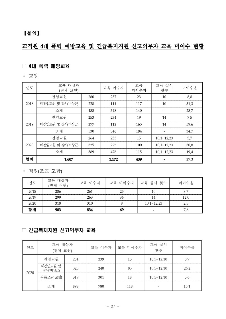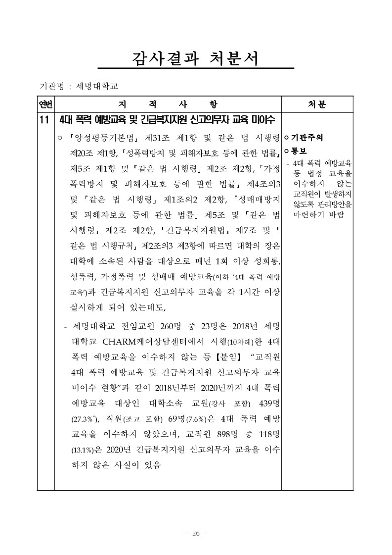 - 세명대학교 전임교원 260명 중 23명은 2018년 세명 대학교 CHARM케어상담센터에서 시행(10차례)한 4대 폭력 예방교육을 이수하지 않는 등【붙임】 “교직원 4대 폭력 예방교육 및 긴급복지지원 신고의무자 교육 미이수 현황”과 같이 2018년부터 2020년까지 4대 폭력 예방교육 대상인 대학소속 교원(강사 포함) 439명 (27.3%*), 직원(조교 포함) 69명(7.6%)은 4대 폭력 예방 교육을 이수하지 않았으며, 교직원 898명 중 118명 (13.1%)은 2020년 긴급복지지원 신고의무자 교육을 이수 하지 않은 사실이 있음