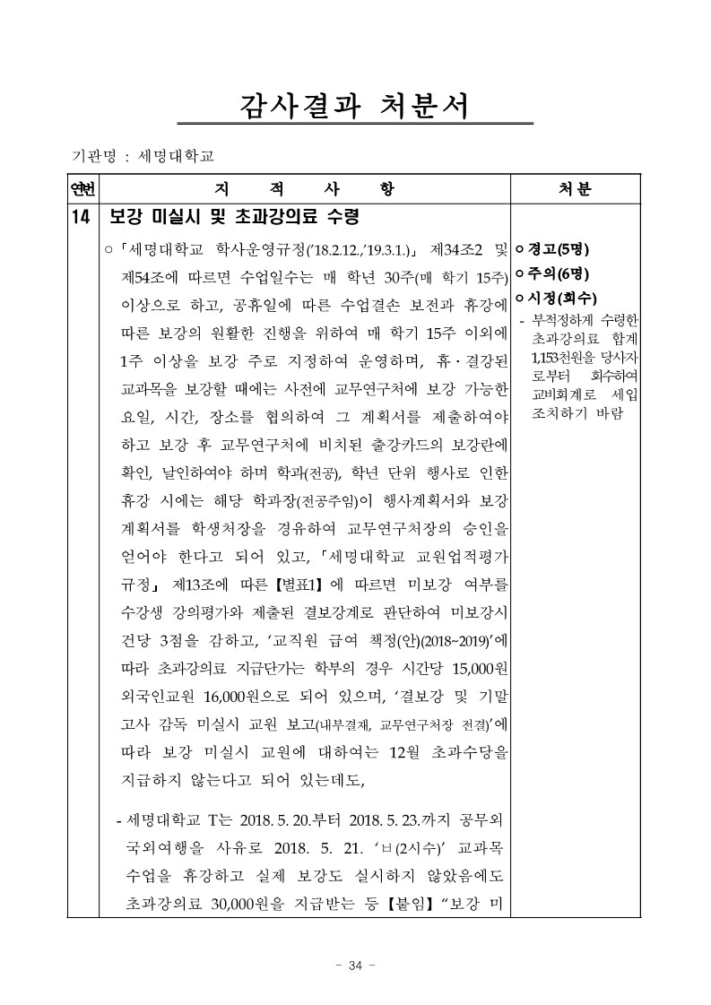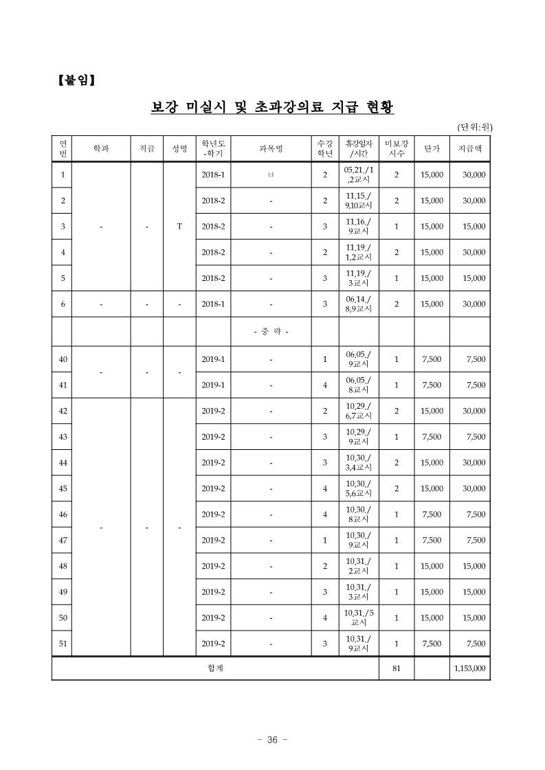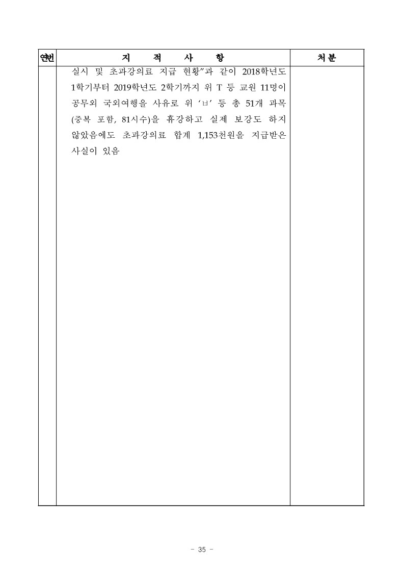 - 세명대학교 T는 2018. 5. 20.부터 2018. 5. 23.까지 공무외 국외여행을 사유로 2018. 5. 21. ‘ㅂ(2시수)’ 교과목 수업을 휴강하고 실제 보강도 실시하지 않았음에도 초과강의료 30,000원을 지급받는 등【붙임】“보강 미실시 및 초과강의료 지급 현황”과 같이 2018학년도 1학기부터 2019학년도 2학기까지 위 T 등 교원 11명이 공무외 국외여행을 사유로 위 ‘ㅂ’ 등 총 51개 과목 (중복 포함, 81시수)을 휴강하고 실제 보강도 하지 않았음에도 초과강의료 합계 1,153천원을 지급받은 사실이 있음