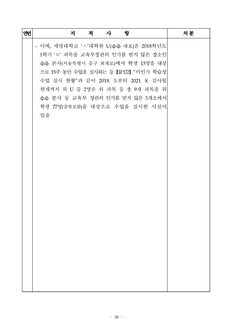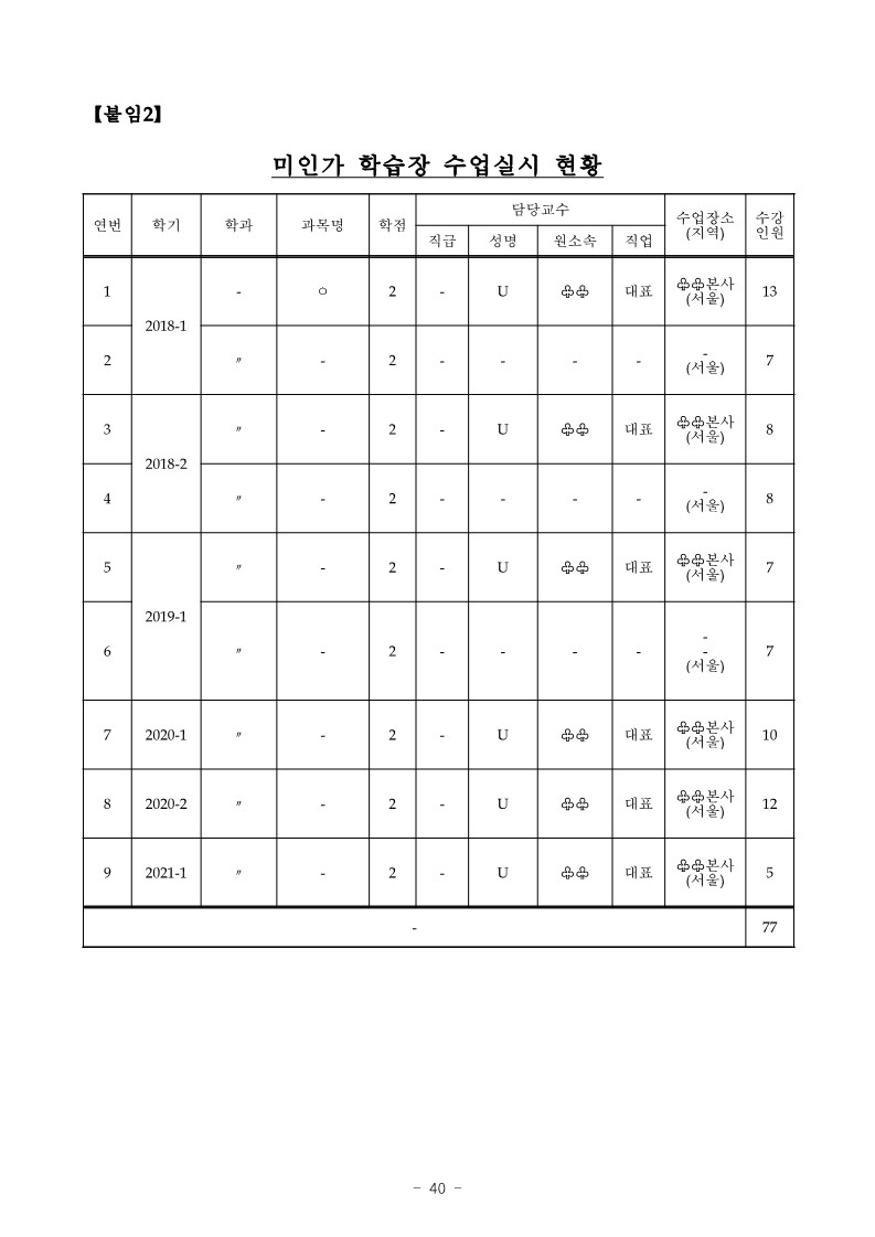 - 이에, 세명대학교 ‘ㅅ’대학원 U(♧♧ 대표)은 2018학년도 1학기 ‘ㅇ’ 과목을 교육부장관의 인가를 받지 않은 장소인 ♧♧ 본사(서울특별시 중구 퇴계로)에서 학생 13명을 대상 으로 15주 동안 수업을 실시하는 등【붙임2】“미인가 학습장 수업 실시 현황”과 같이 2018. 3.부터 2021. 8. 감사일 현재까지 위 U 등 2명은 위 과목 등 총 9개 과목을 위 ♧♧ 본사 등 교육부 장관의 인가를 받지 않은 3개소에서 학생 77명(중복포함)을 대상으로 수업을 실시한 사실이 있음