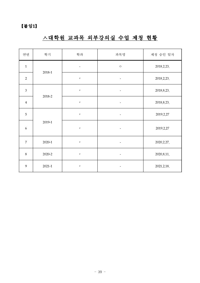 - 세명대학교 ‘ㅅ’대학원은 2018. 2. 23. ‘ㅇ’ 등 2과목을 외부강의실에서 수업을 실시한다는 내용을 담은 ‘2018-1학기 ‘ㅅ’대학원 교과목 개설 승인’ 건을 내부 결재로 총장에게 제청하여 승인 받는 등【붙임1】“ㅅ 대학원 교과목 외부강의실 수업 제청 현황”과 같이 2018. 2.부터 2021. 2. 18.까지 위 ‘ㅇ’ 등 총 9개 과목을 외부강의실에서 수업을 실시한다는 내용으로 총장(내부 결재)에게 제청하고 승인받은 사실이 있음