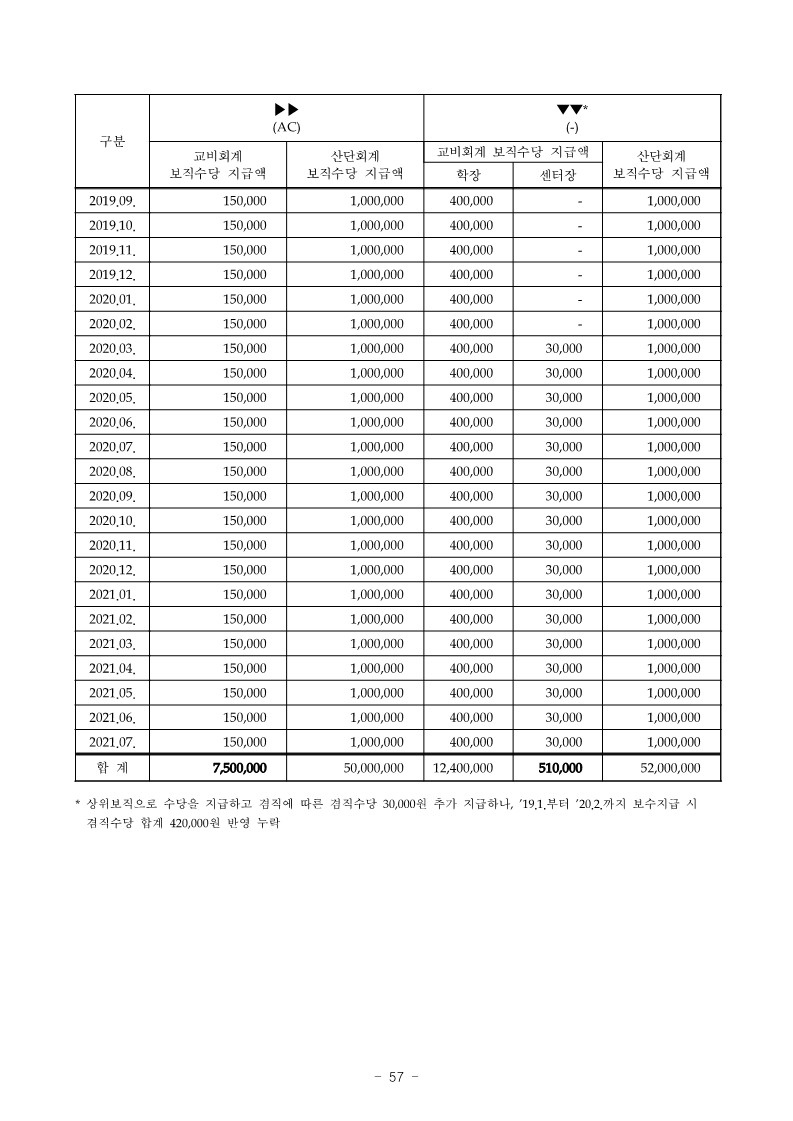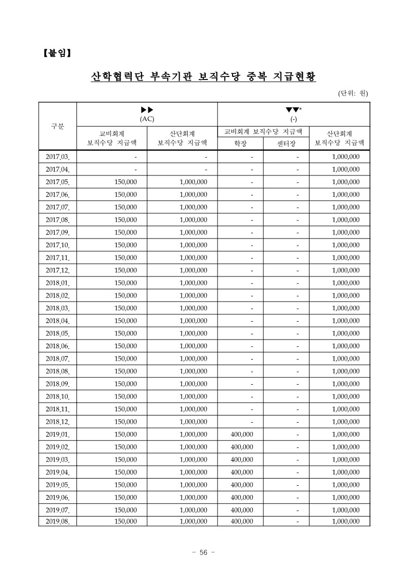 - 세명대학교 산학협력단은 2017. 5. 대학 보직발령으로 ▶▶ 보직수당 150천원을 교비회계에서 지급받은 AC 에게 “▶▶ 및 ▼▼ 운영 방안(’17.3.9, 총장결재)”을 근거로 보직수당 1,000천원을 산단회계에서 지급하는 등【붙임】 “산학협력단 부속기관 보직수당 중복 지급현황”과 같이 2017. 5. 부터 2021. 7.까지 대학 보직 발령으로 보직수당 합계 8,010천원을 교비회계에서 지급받은 산학협력단 부속기관 보직자 위 AC 등 2명에게 보직 수당 명목으로 합계 104,000천원을 산학협력단회계에서 지급한 사실이 있음