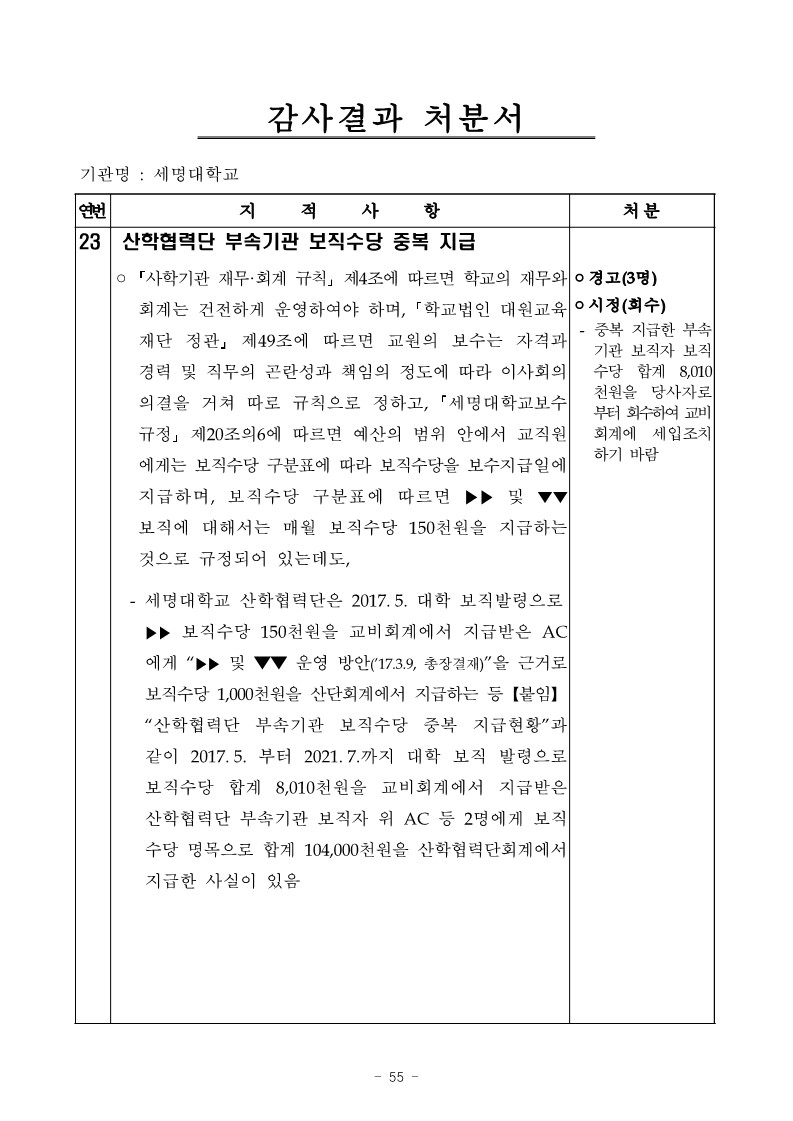- 중복 지급한 부속기관 보직자 보직 수당 합계 8,010 천원을 당사자로 부터회수하여교비 회계에 세입조치 하기 바람