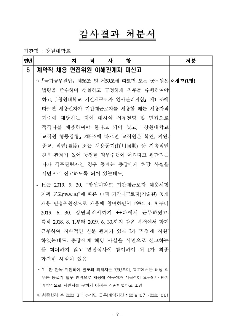 - H는 2019. 9. 30. “창원대학교 기간제근로자 채용시험 계획 공고(‘19.9.18.)”에 따른 ++과 기간제근로자(기술원) 공개 채용 면접위원장으로 채용에 참여하면서 1984. 4. 8.부터 2019. 6. 30. 정년퇴직시까지 ++과에서 근무하였고 특히 2018. 8. 1.부터 2019. 6. 30.까지 같은 부서에서 함께 근무하여 지속적인 친분 관계가 있는 I가 면접에 지원 하였는데도, 총장에게 해당 사실을 서면으로 신고하는 등 회피하지 않고 면접심사에 참여하여 위 I가 최종 합격한 사실이 있음